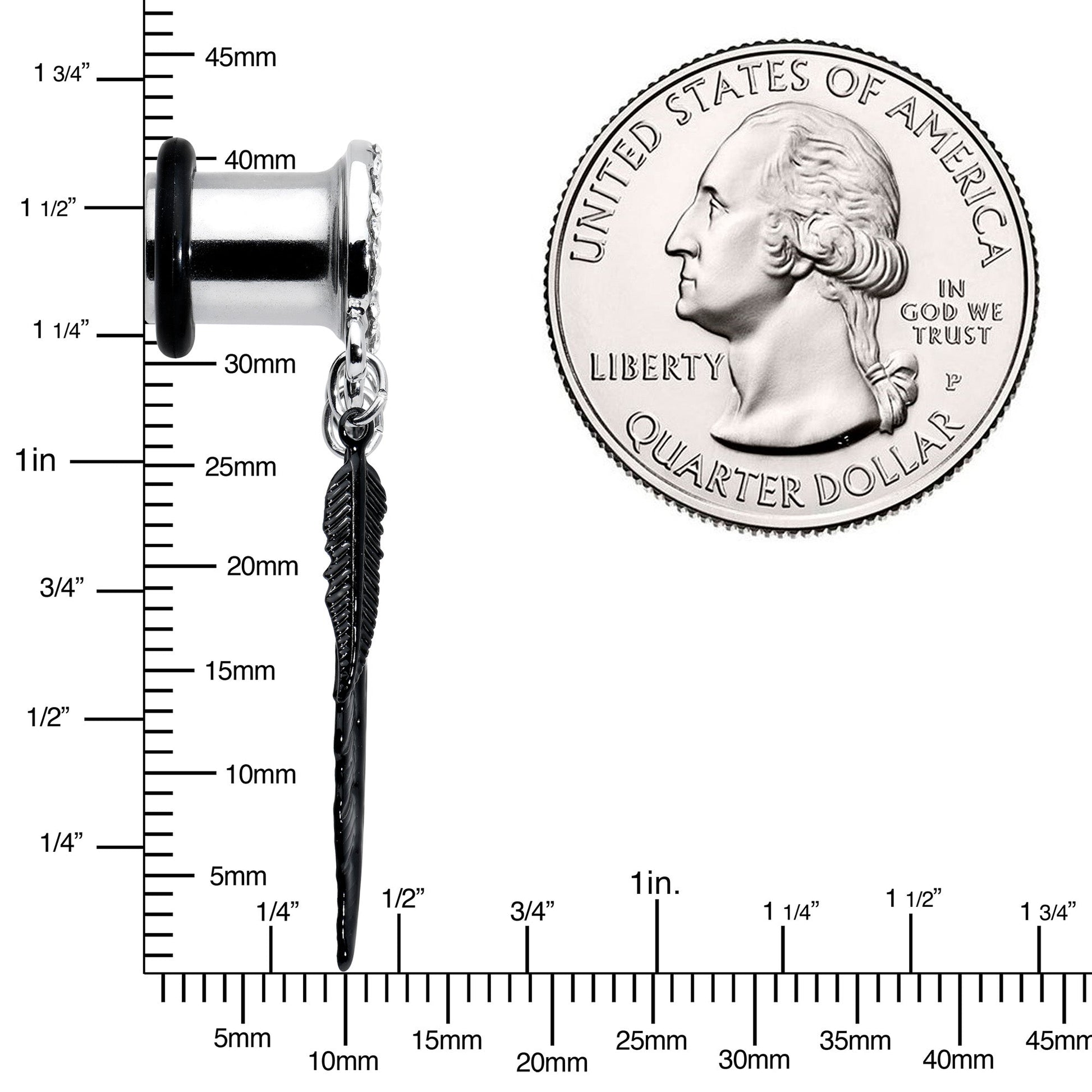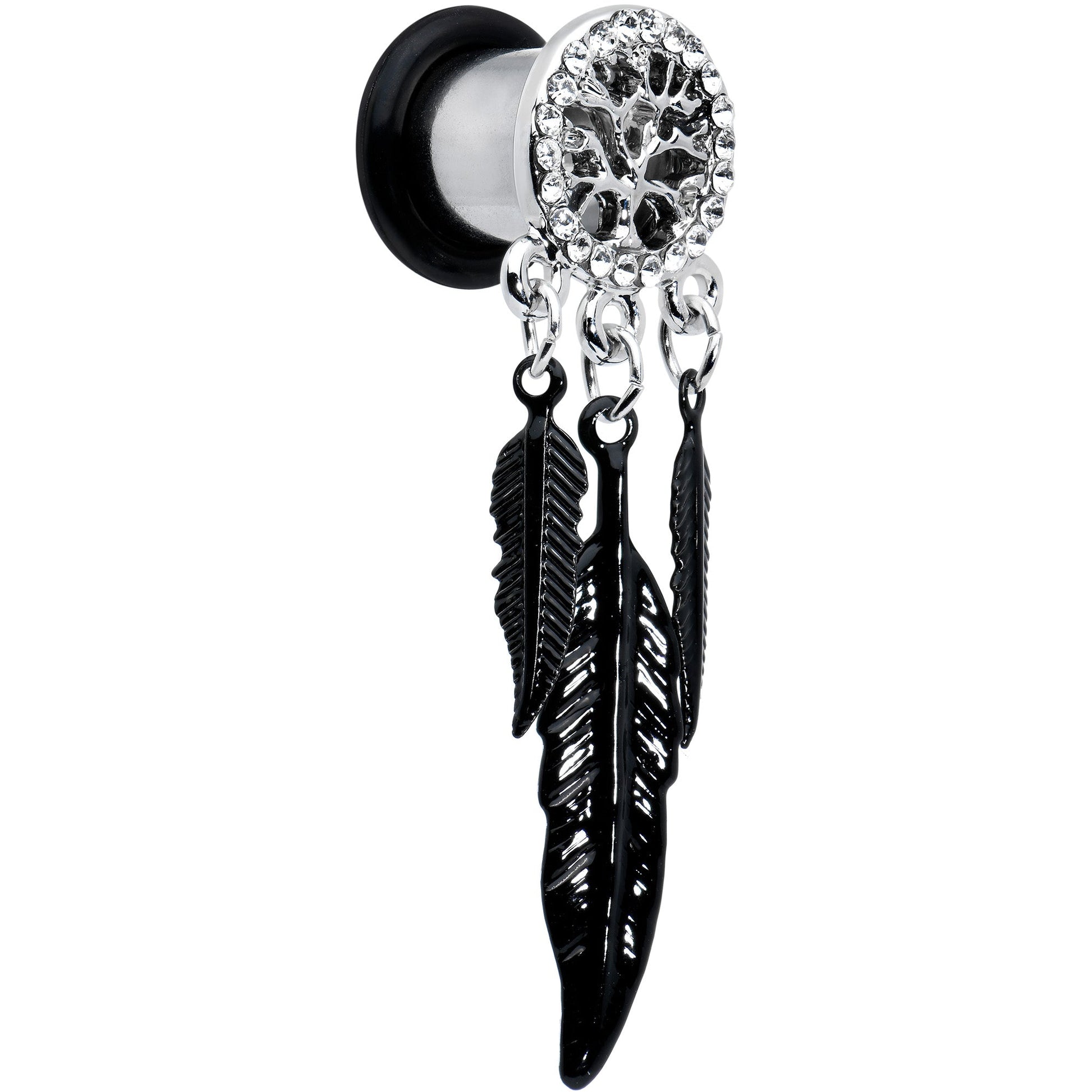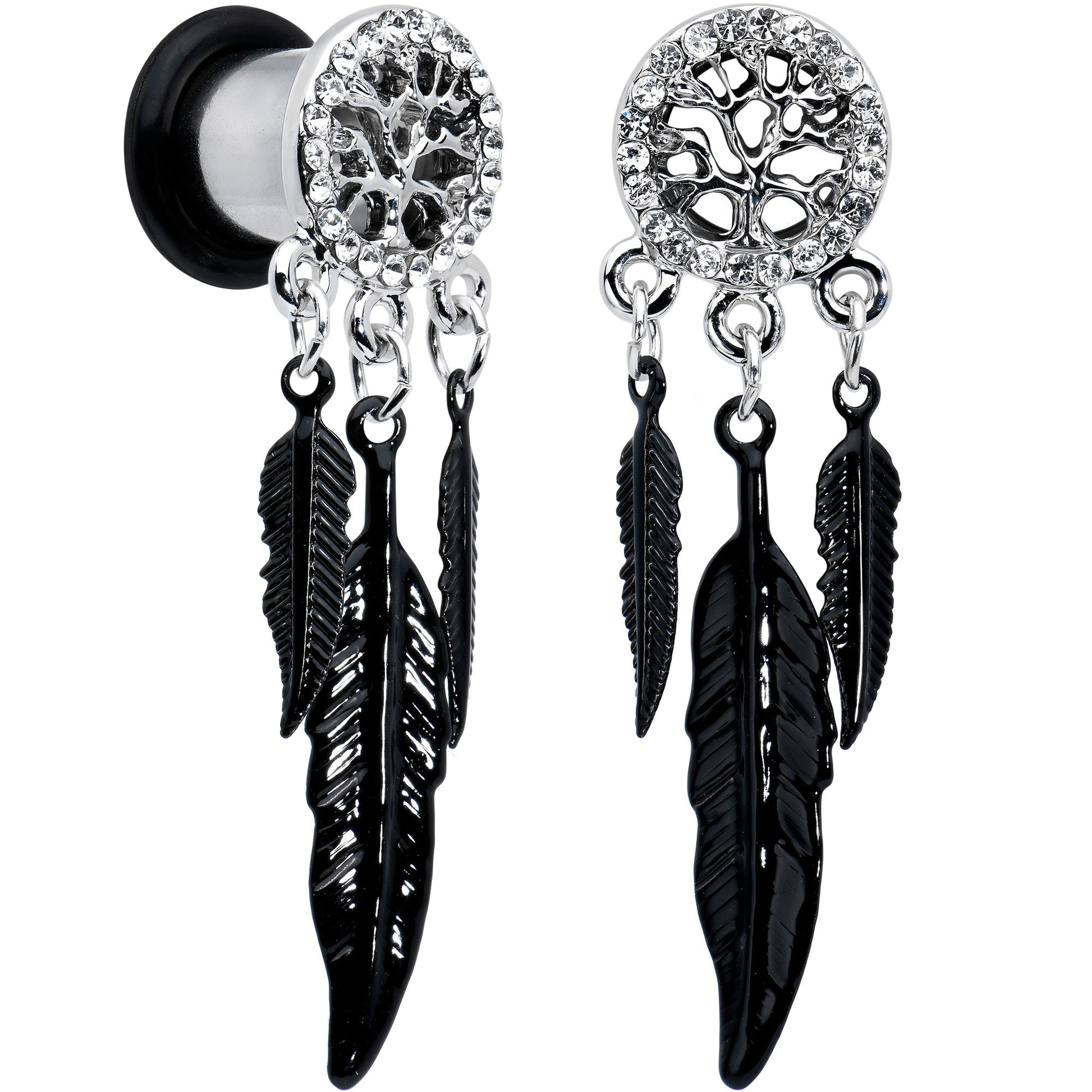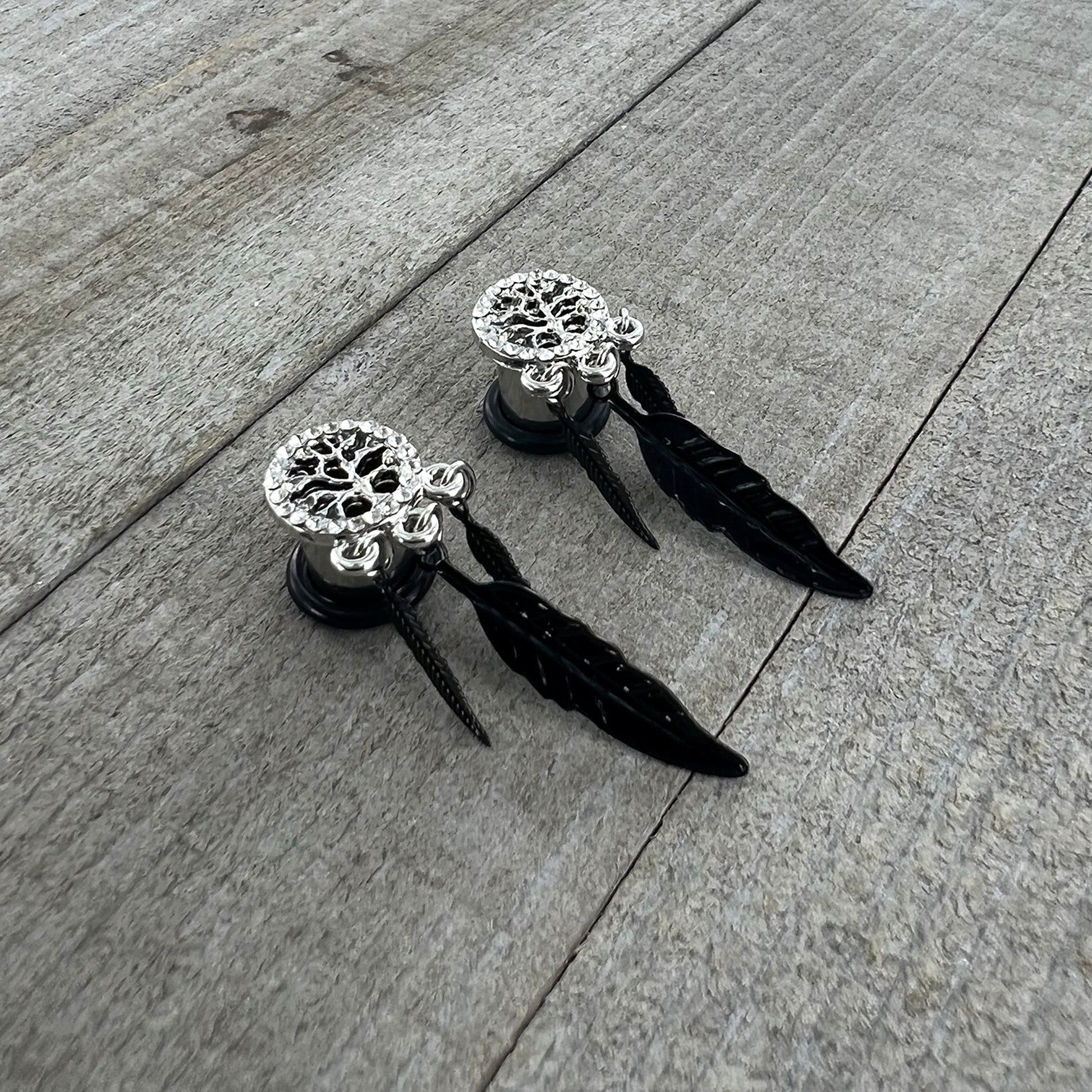 Let everyone know that your spiritual side is in perfect balance with these 0 gauge 316L surgical grade stainless steel tree of life single flare plugs with black feather dangles and clear gem accents that draw the eye. This item includes rubber o-rings and is sold in a set of two.