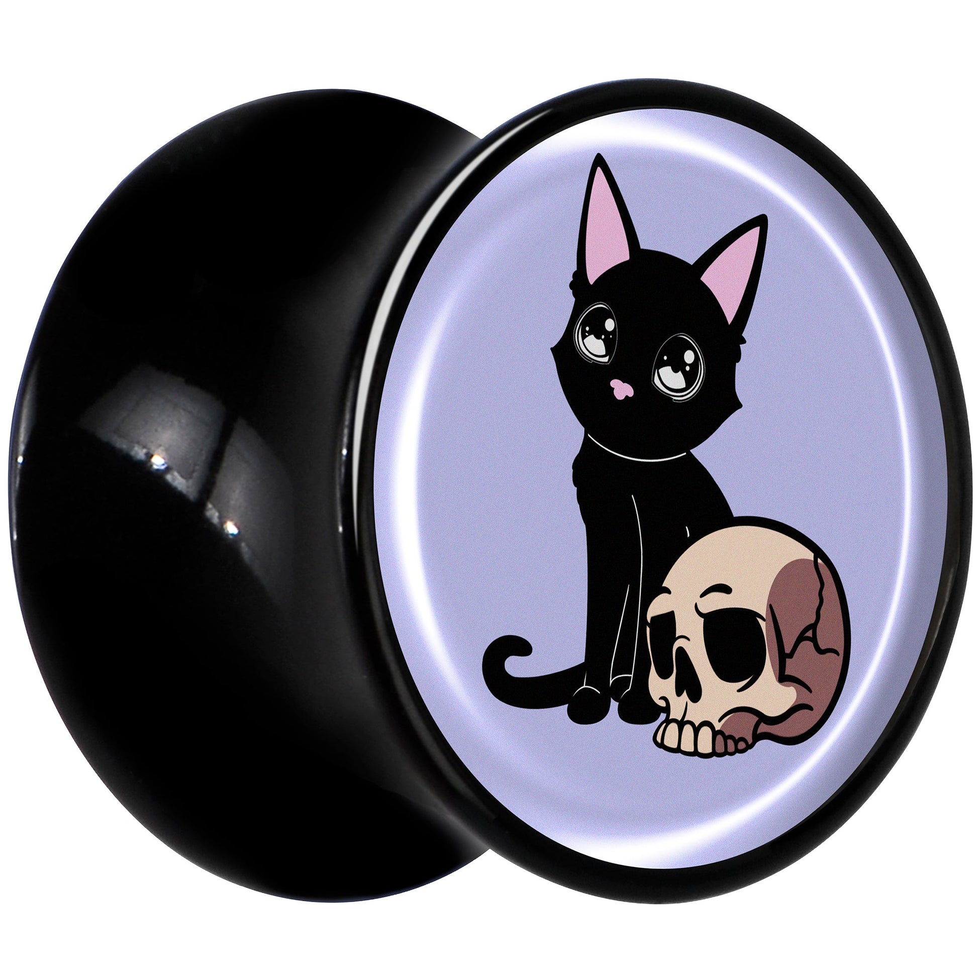 Add some witchy wonder to your look with these 8mm saddle plugs for stretched lobes. They're made with black acrylic and feature a saddle design for comfortable insertion and removal. Each one features a black cat, perched next to a creepy skull. They are depicted on a blue background to really make the details pop. You'll cast a spell of style when you're rocking these fantastic, feline and skull ear gauges. Sold as a set of two.