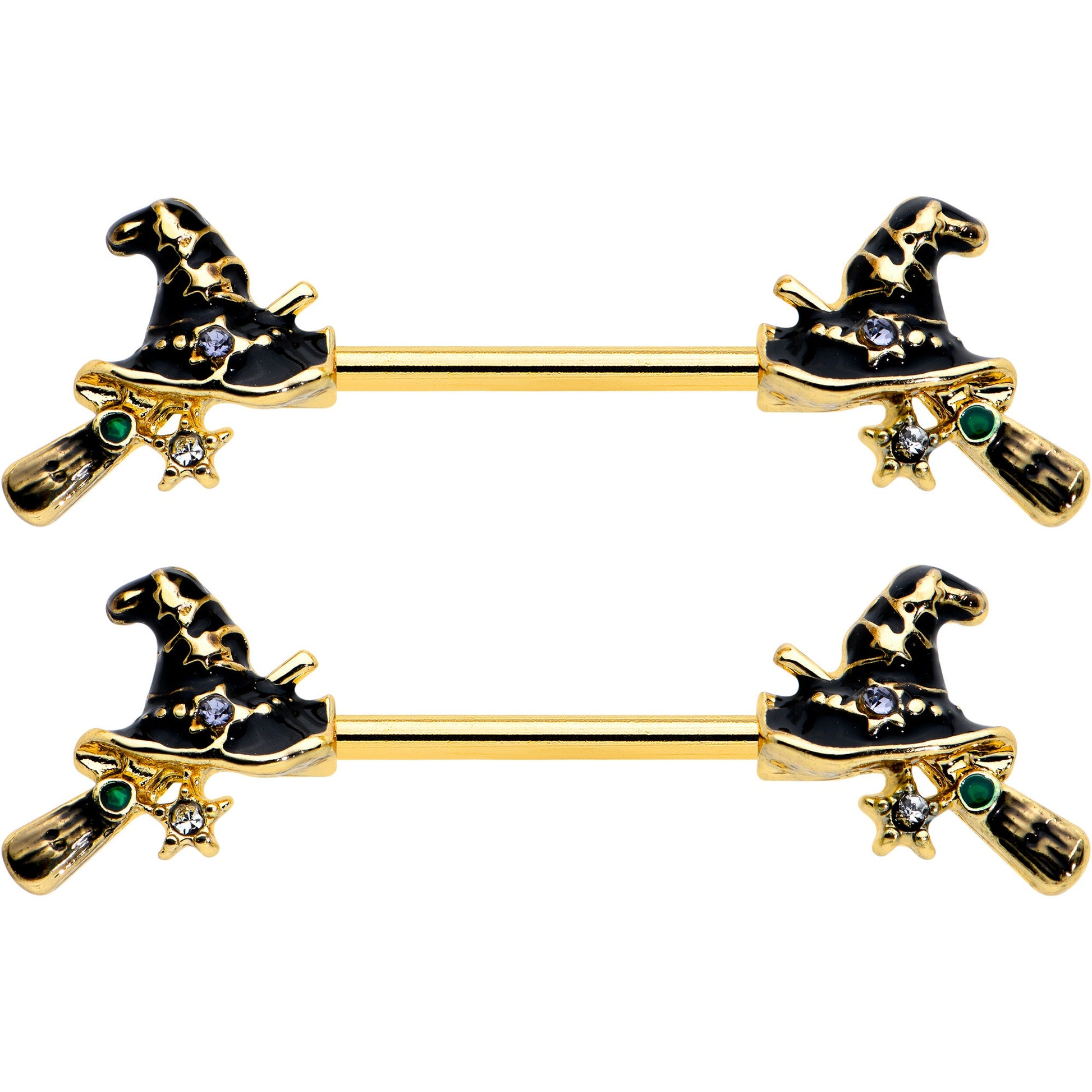 With this 14 gauge nipple jewelry, you'll have everything you need to cast your spell this Halloween! It's made with 14mm gold tone PVD over 316L surgical grade stainless steel straight barbells. Each of the ends features a witch's hat charm, inlaid in black and embellished with a clear gem set in a tiny star. They're further embellished with a broom charm which is set with a black gem and a tiny star which is set with a clear gem center. These Halloween nipple piercing rings are absolutely magic! Sold as a set of two.Specifications