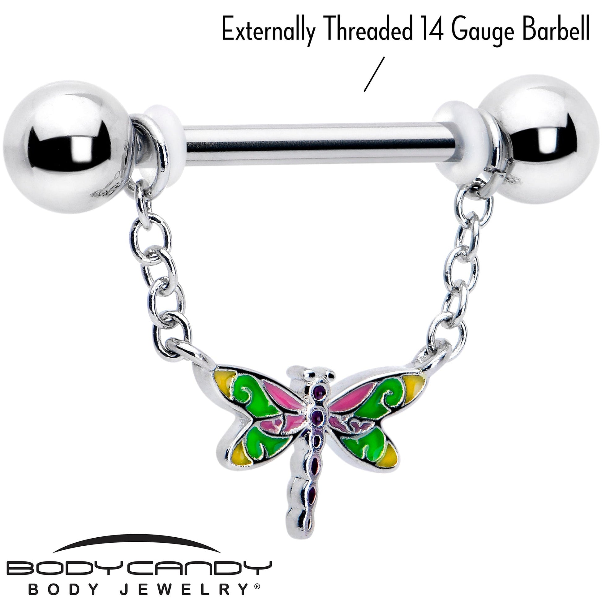 14 Gauge 9/16 Dragonfly Colors Chain Dangle Nipple Ring Set