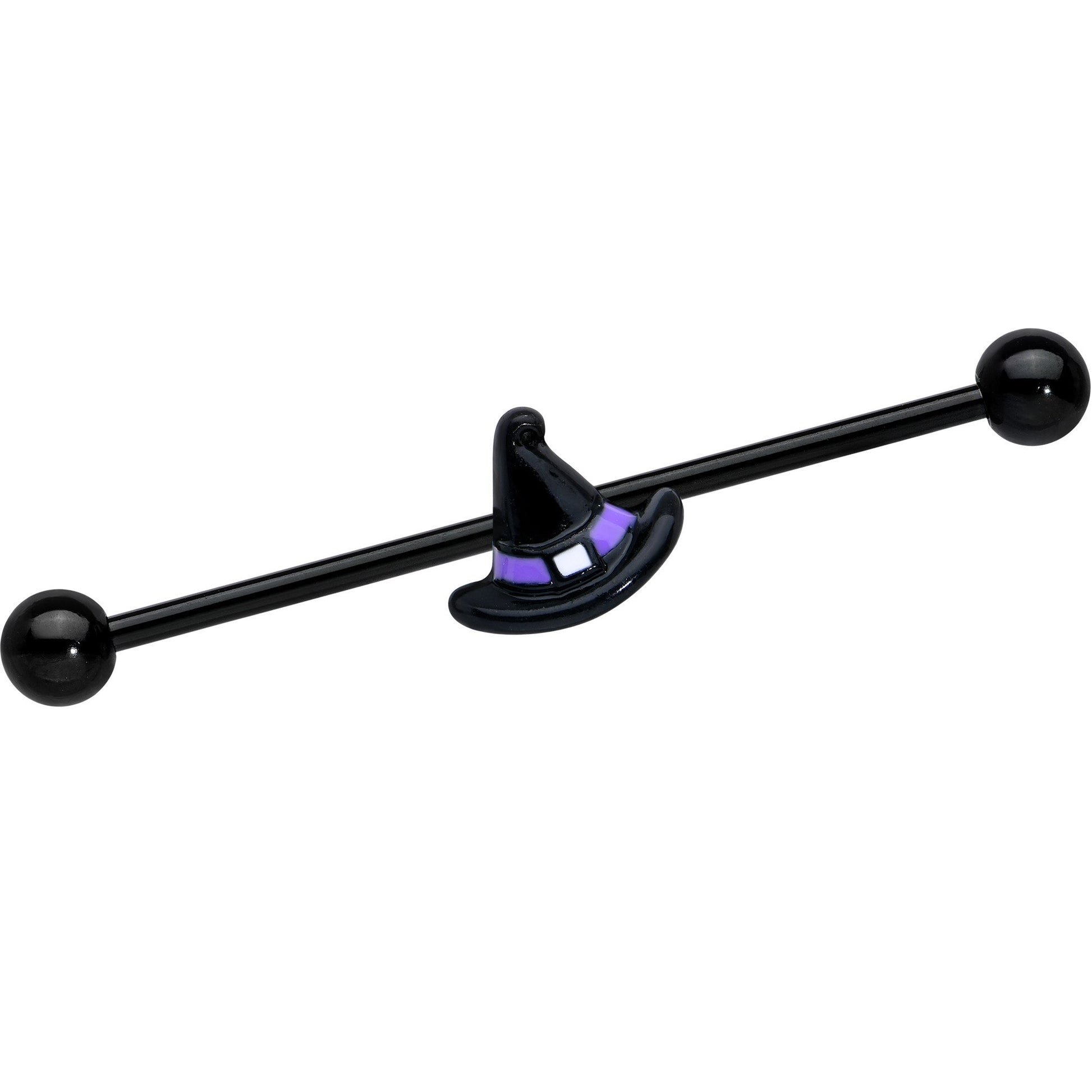 Get your Halloween hat on without mussing your hair with this 14 gauge helix barbell! It's made with a 1 1/2" black PVD over 316L surgical grade stainless steel straight barbell with a 5mm ball ends. It features a black witch's hat charm, with a purple band and white buckle. You can even slide it up and down the length of the barbell for the perfect look! Let your industrial piercing cast a spell with this haunting Halloween barbell earring!Specifications