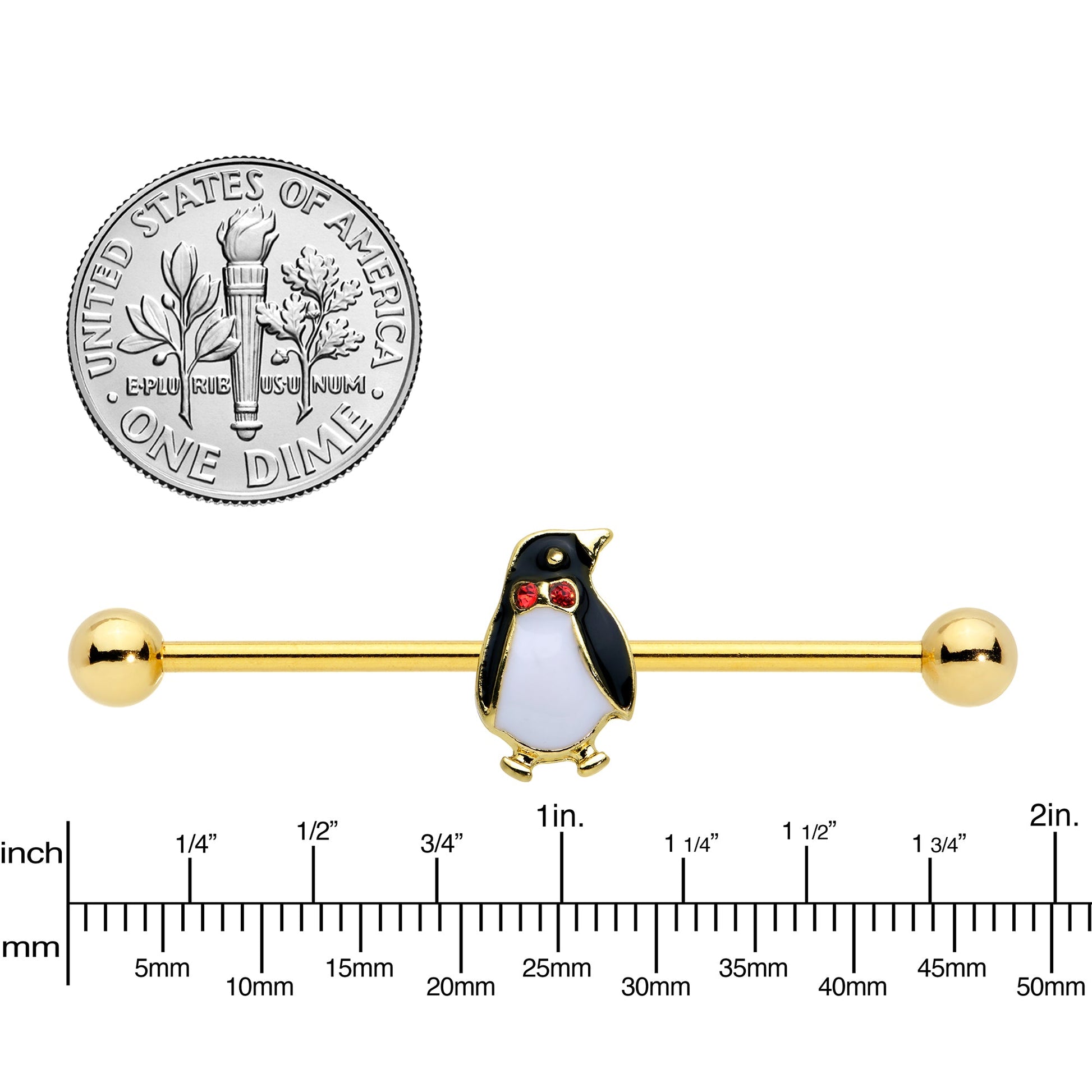 Keep cool this holiday season with this fun 14 gauge helix barbell with winter style. It's made with a 1 1/2 inch gold tone PVD over 316L surgical grade stainless steel straight barbell with 5mm ball ends. It features a penguin charm, wearing a fashionable bow tie with red gem embellishments. You can even slide it up and down the length of the barbell for the perfect look. It's never too cold to look fabulous with this polished-looking penguin barbell earring.Specifications