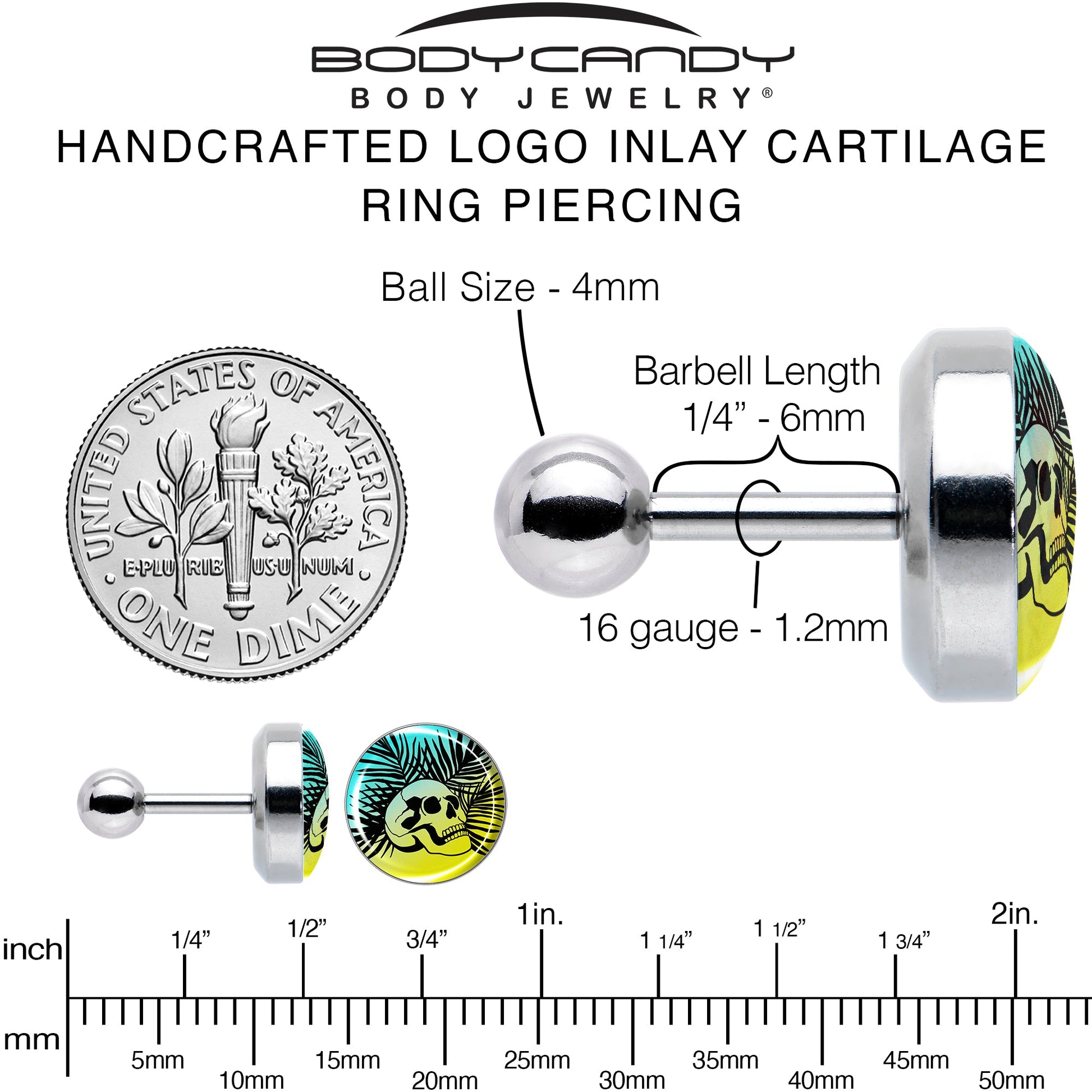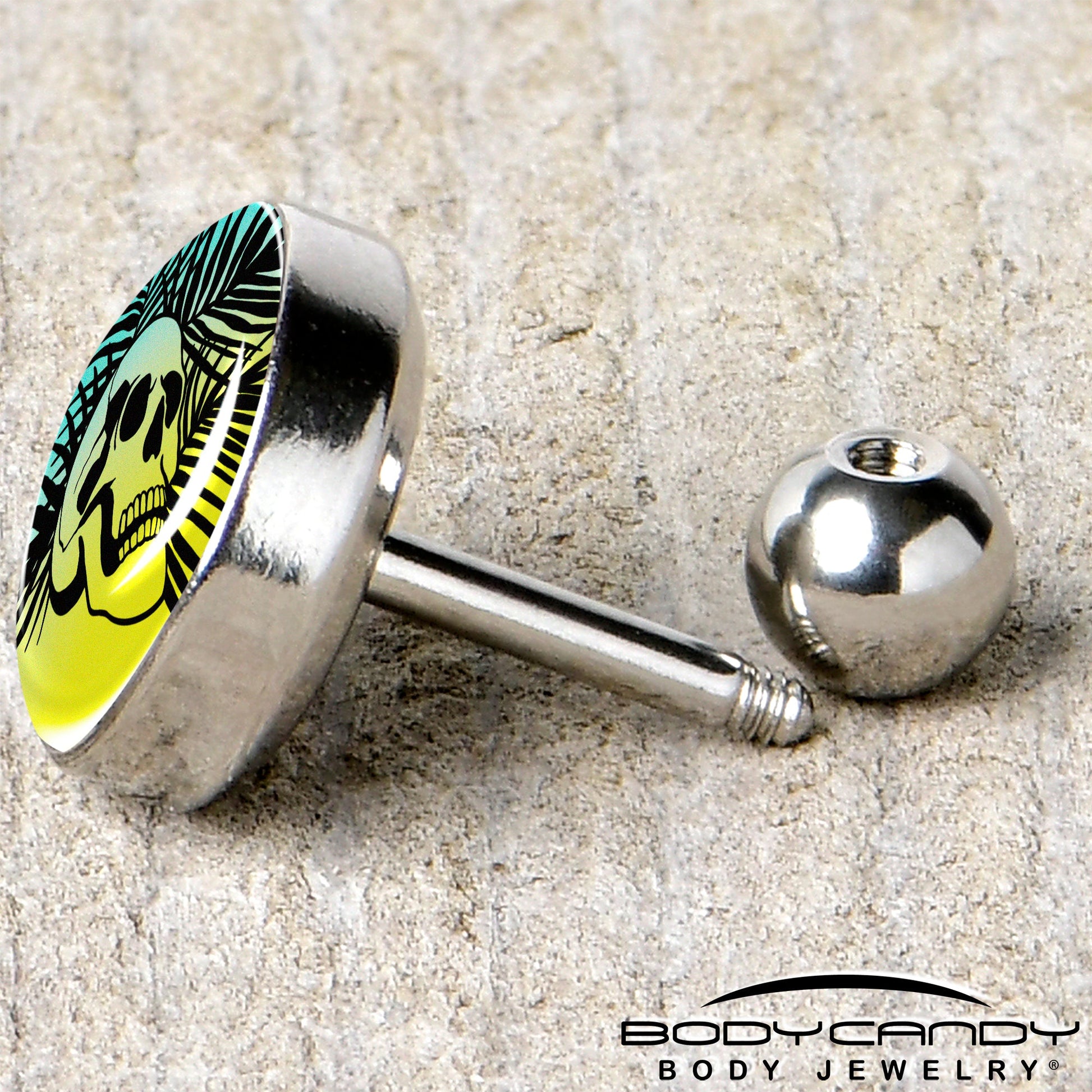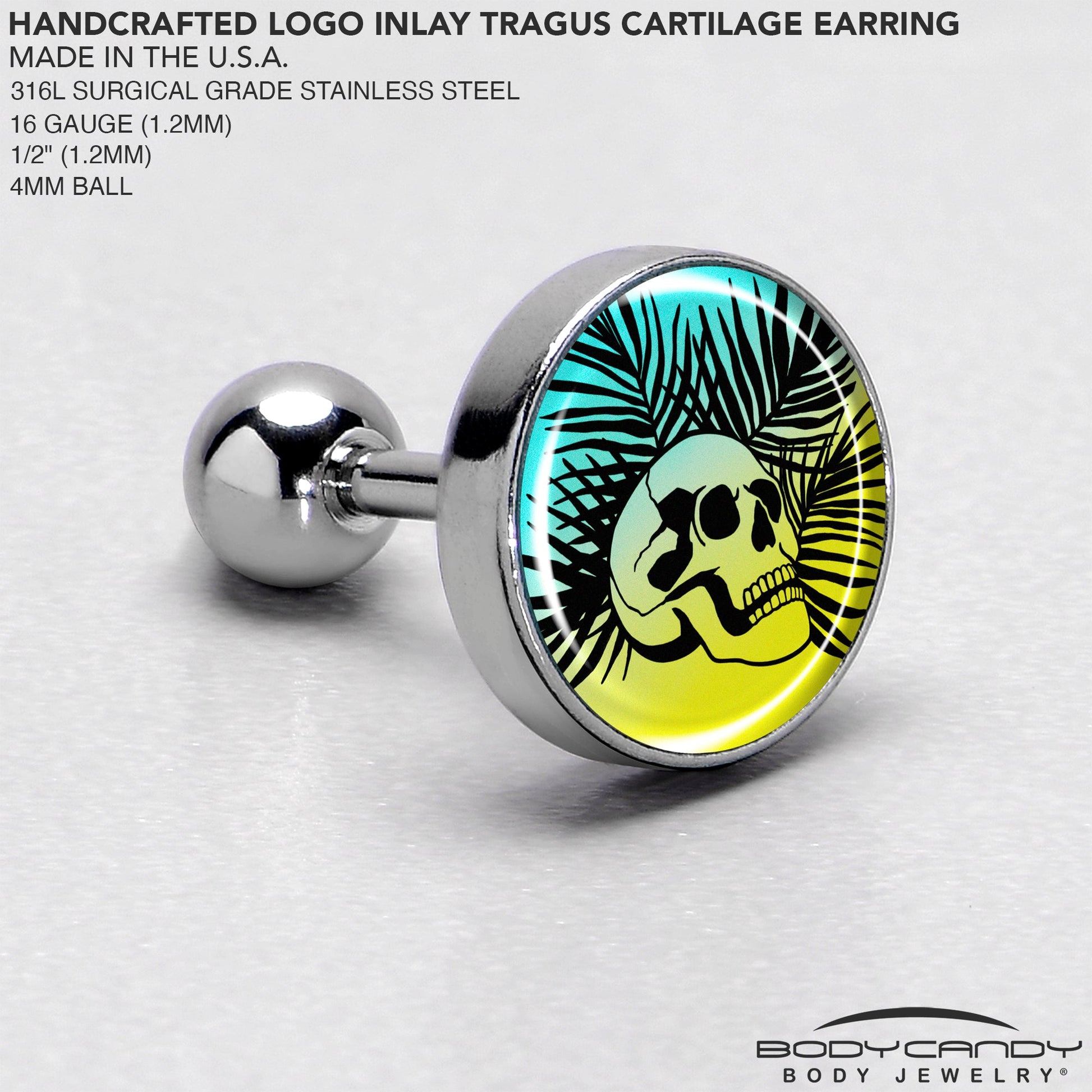 Hypoallergenic jewelry for sensitive skin.16 Gauge 1/4 Blue Haze Sunset Skull and Palms Tragus Cartilage Earring