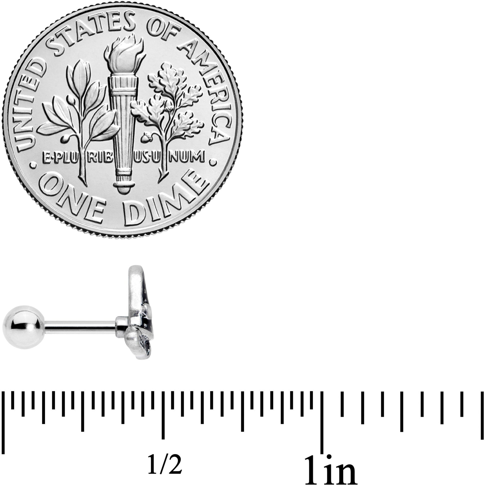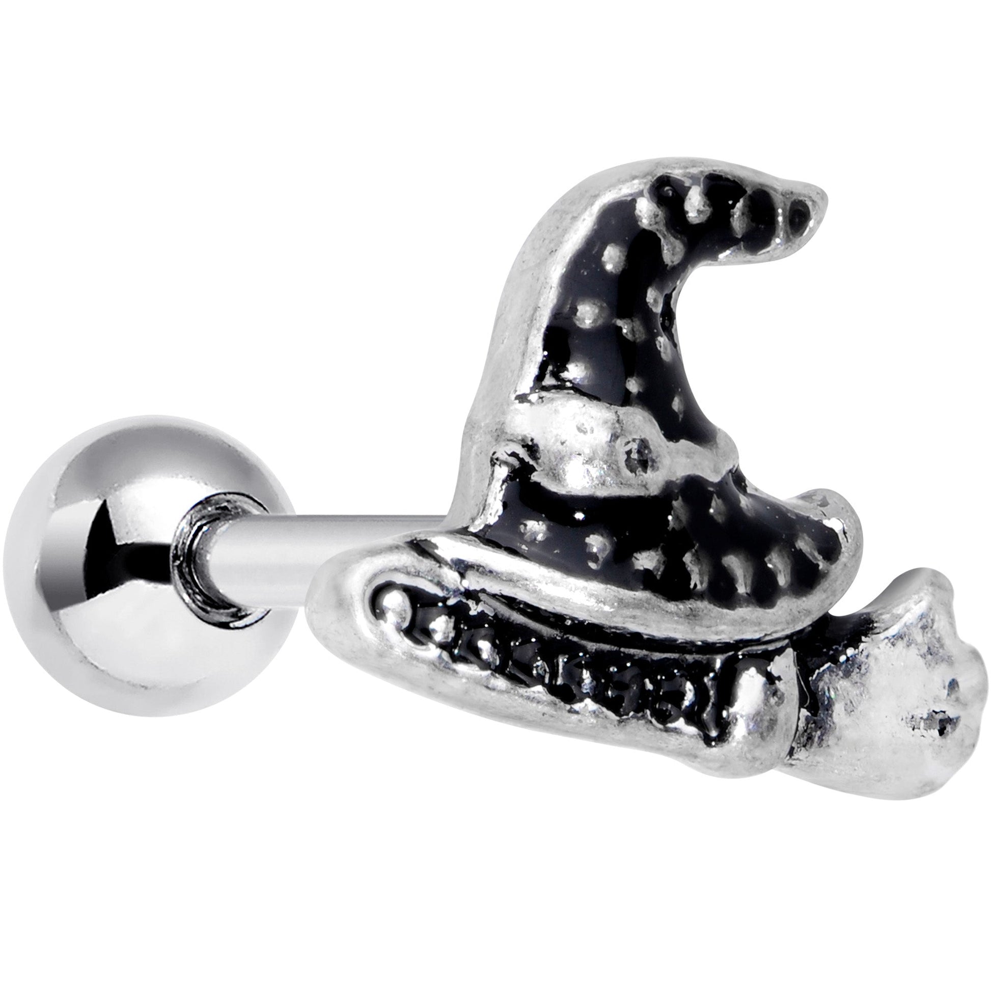 You'll have everything you need to make Halloween magic with this 16 gauge cartilage stud! It's made with a 6mm durable 316L surgical grade stainless steel straight barbell with a 4mm ball end. It features a witch's hat charm, with textured embellishment that's burnished to really make the details pop. Beneath the hat is a broom, the handle embellished with matching textured details. You can even wear this cartilage ring in multiple piercings including tragus, helix, and some conch piercings. Cast a spell this Halloween with this witch-themed tragus stud!Specifications