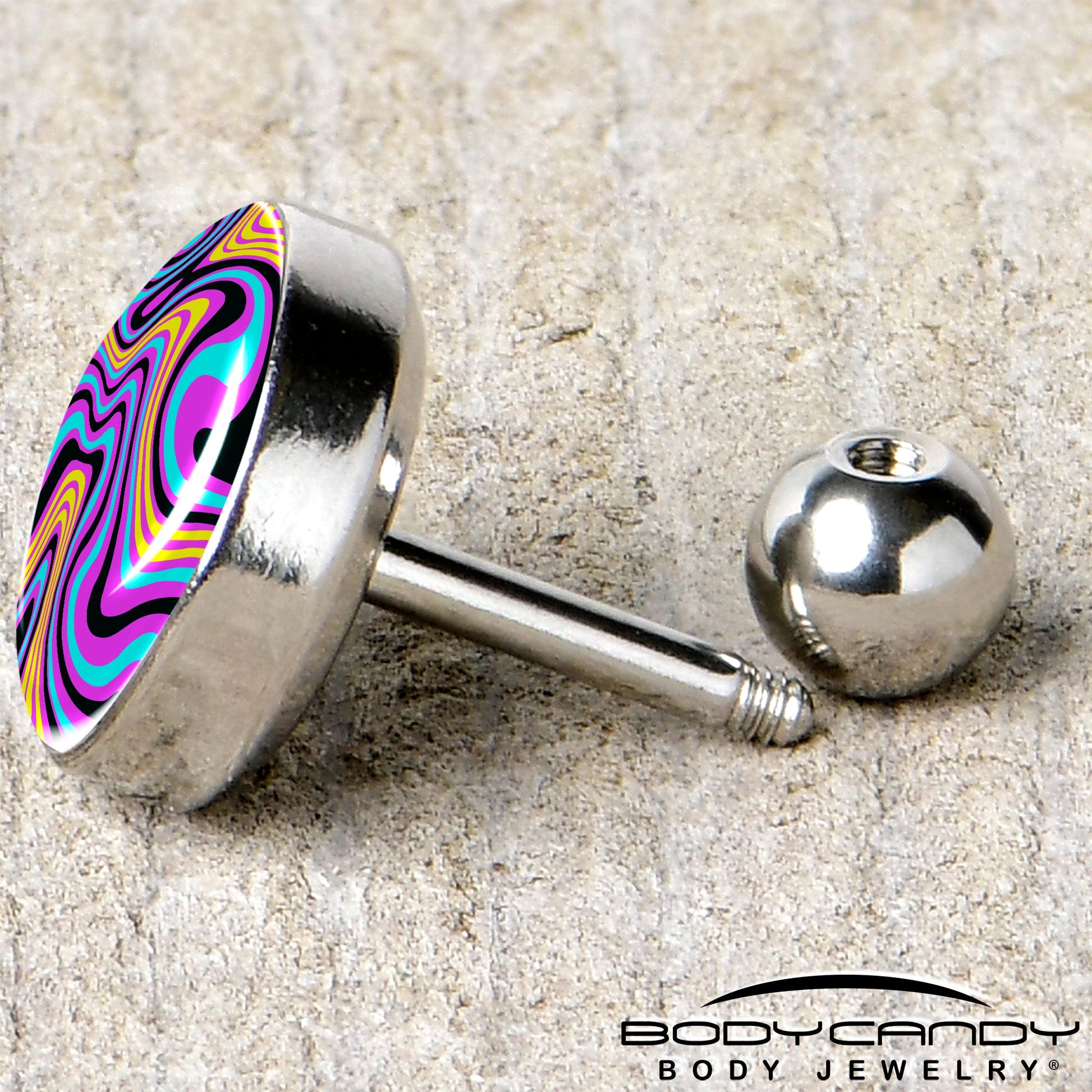 This artist hand-drawn vibrant funky swirl pattern 16 gauge tragus stud is the perfect blend of funky colors and a whimsical swirl pattern designed to bring a unique touch to your body piercing jewelry collection. Made from a 6mm hypoallergenic 316L surgical grade stainless steel straight barbell, this cartilage piercing ring ensures comfort for sensitive skin while maintaining a durable and long-lasting shine. The 4mm ball end allows for easy insertion and removal, making it a practical addition to your jewelry box that you can rock in multiple piercings including tragus, helix, and some conch piercings. Whether you're new to cartilage piercings or adding to your collection, this helix jewelry is sure to stand out.
