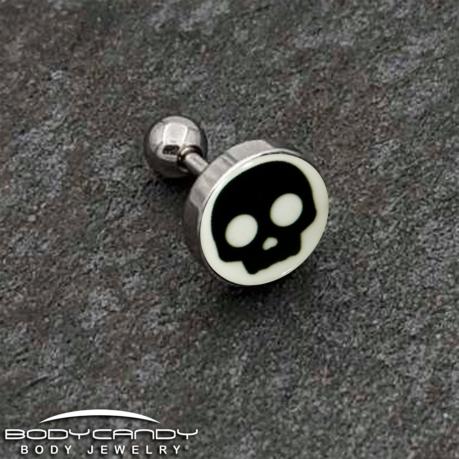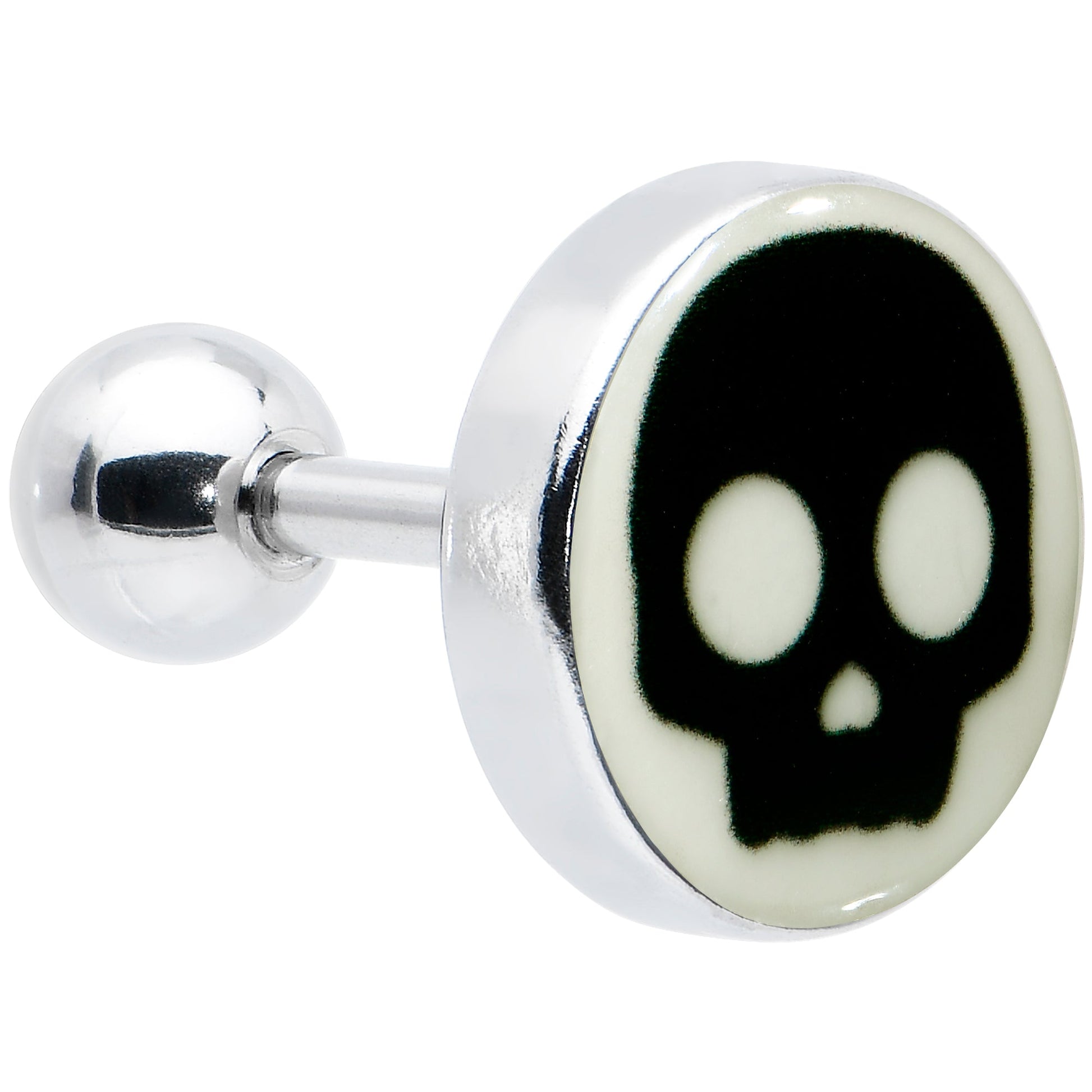 Get a look that will strike 'em dead with this 16 gauge tragus stud. It's made with a 6mm durable 316L surgical grade stainless steel straight barbell with a 4mm ball end. It features a simple silhouette of a black skull on a white background. When the lights go down, it glows in the dark and you can even rock it in multiple piercings including tragus, helix, and some conch piercings.. You'll totally knock 'em dead with this glow in the dark, gothic skull cartilage piercing jewelry.