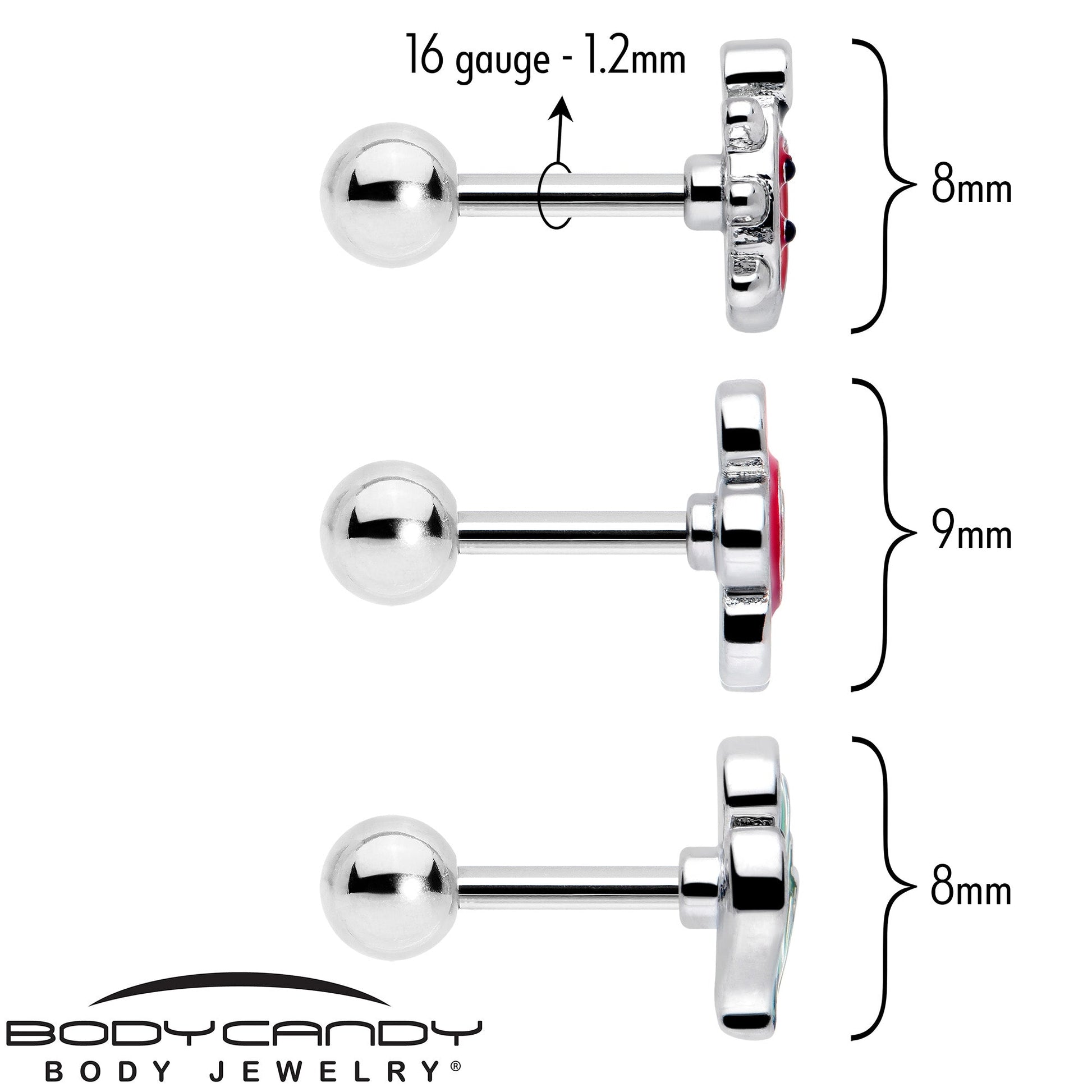 Get a look for every occasion with this set of 16 gauge tragus studs. They are made with 6mm durable 316L surgical grade stainless steel straight barbells with 4mm ball ends. One features a simple flower charm, with red petals and a happy smiling face on its yellow center. The second one features a whimsical ladybug charm, embellished with red inlay and black spots for a more realistic appearance. The third features a simple green leaf charm with textured detailing and you can wear these in multiple piercings including helix, tragus, and some conch piercings. You will be ready for anything with this cartilage piercing jewelry. Sold as a set of three.Specifications