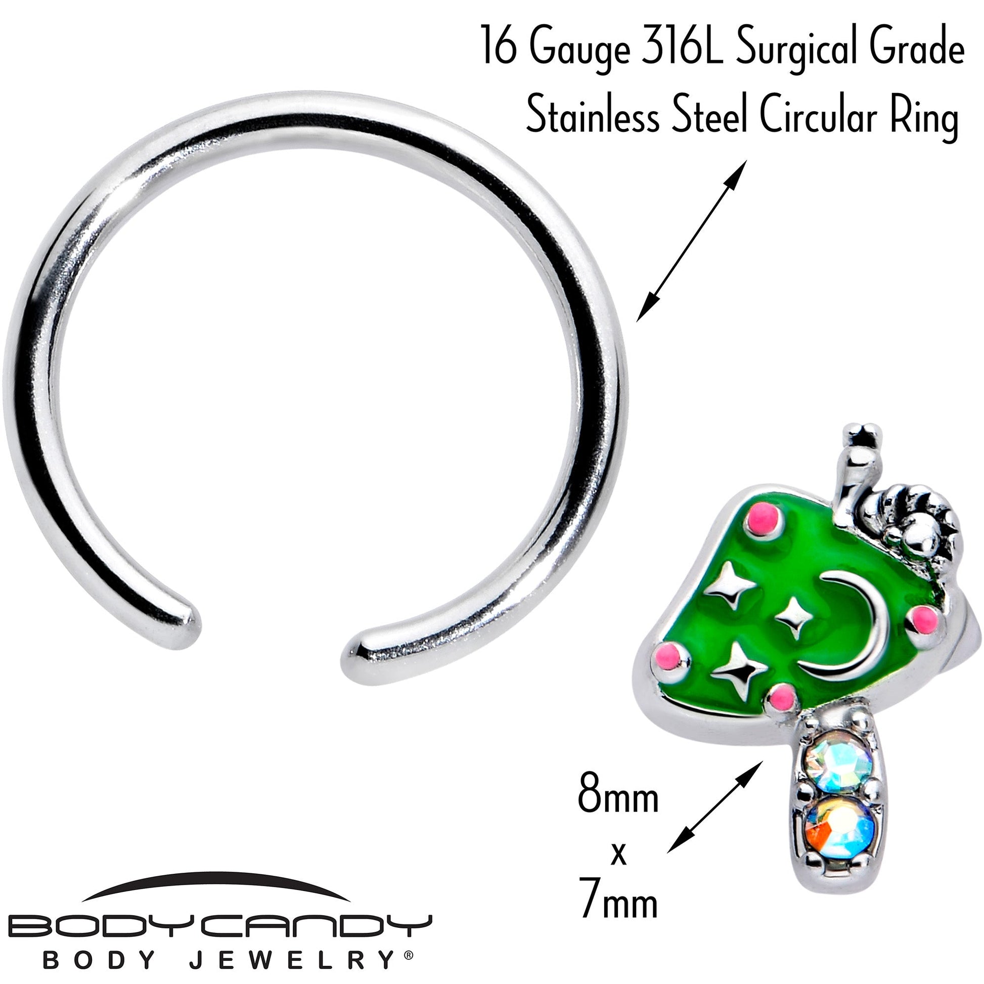 Get trippy in colorful style with this 16 gauge septum ring. It is made with a 10mm durable 316L surgical grade stainless steel circular ring. It features a mushroom charm, with a green cap and pink embellishments as well as aurora gems in the stem. It is further embellished with mystical designs and a tiny snail perched on top. It even features a captive charm design for secure wear and you can rock it in multiple piercings including tragus, helix, and some daith piercings. Get psychedelic style and elegant color with this modern mushroom cartilage piercing jewelry.Specifications