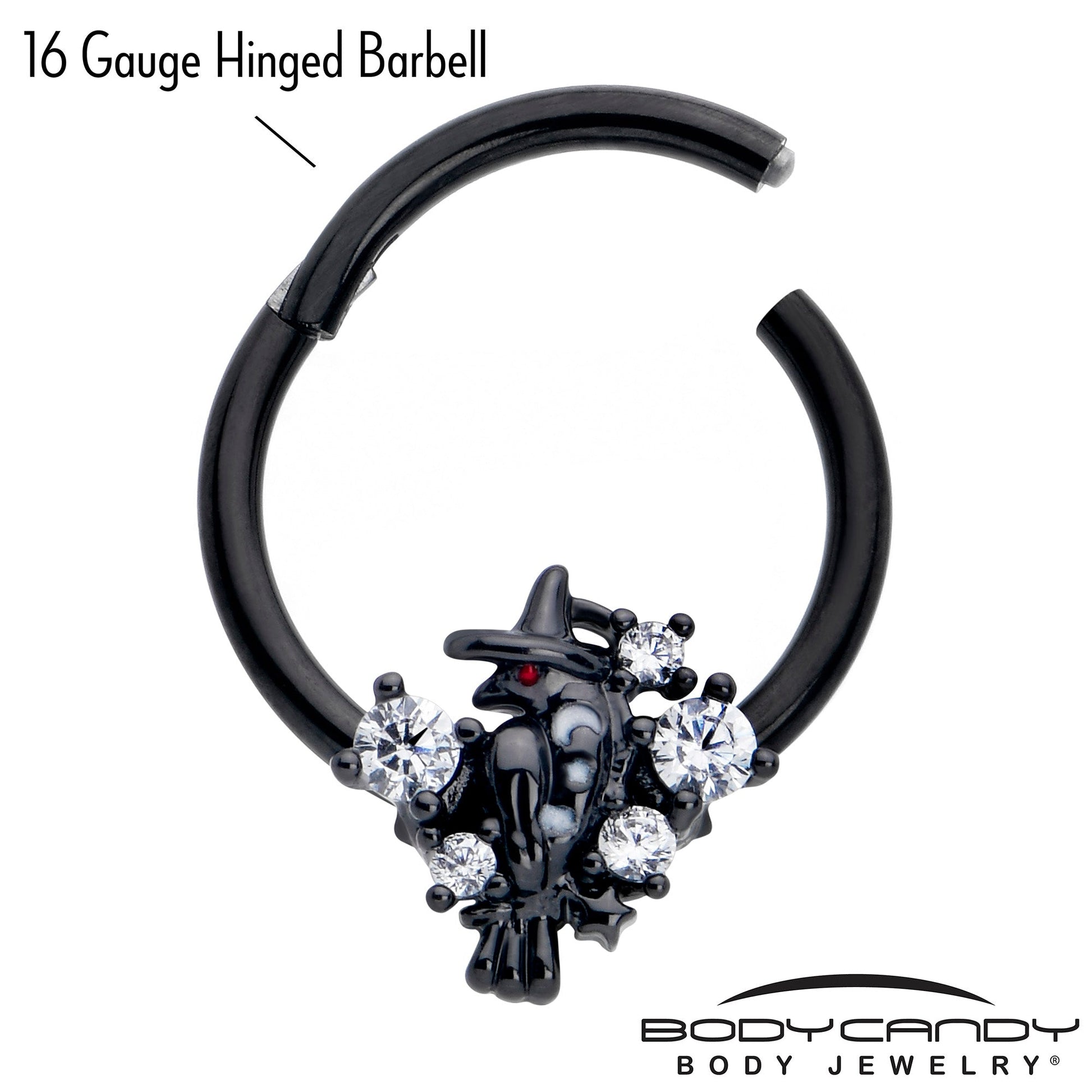 Nevermore will you be searching for the right look when you're rocking this 16 gauge septum ring. It's made with a 10mm black PVD over 316L surgical grade stainless steel hinged circular ring. It features a charm of a black raven, wearing a witch's hat. It's embellished with clear cubic zirconia gems for striking contrast. It also features a non-removable, hinged segment that makes insertion and removal a breeze and you can rock it in multiple piercings including tragus, helix, and some daith piercings. Make magic and rule the skies with this gorgeously gothic cartilage piercing jewelry.Specifications