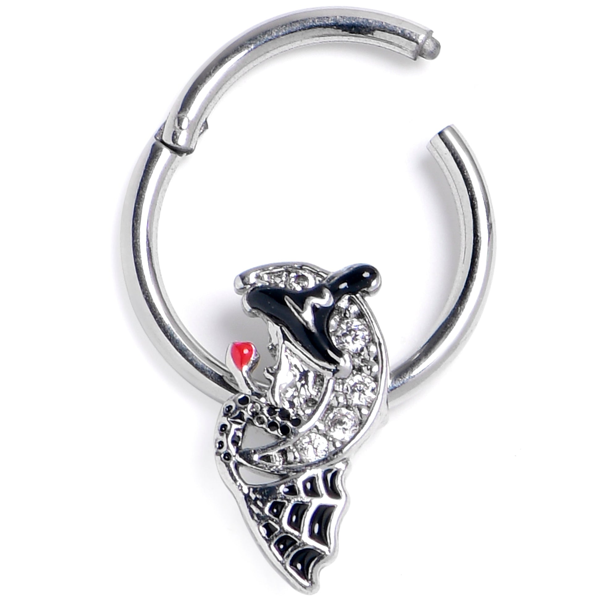 The witch on this 16 gauge septum ring has found the perfect spot for some stargazing. It is made with a 10mm durable 316L surgical grade stainless steel hinged circular ring. It features a crescent moon charm, set with clear gems. Sitting on the moon is a witch, with a black detailed hat, spiderweb embellishment on her dress, and a red orb that she appears to be gazing into. It also features a non-removable, hinged segment that makes insertion and removal a breeze and you can rock it in multiple piercings including tragus, helix, and some daith piercings. You will be seeing stars too with this wonderful witch cartilage piercing jewelry.Specifications