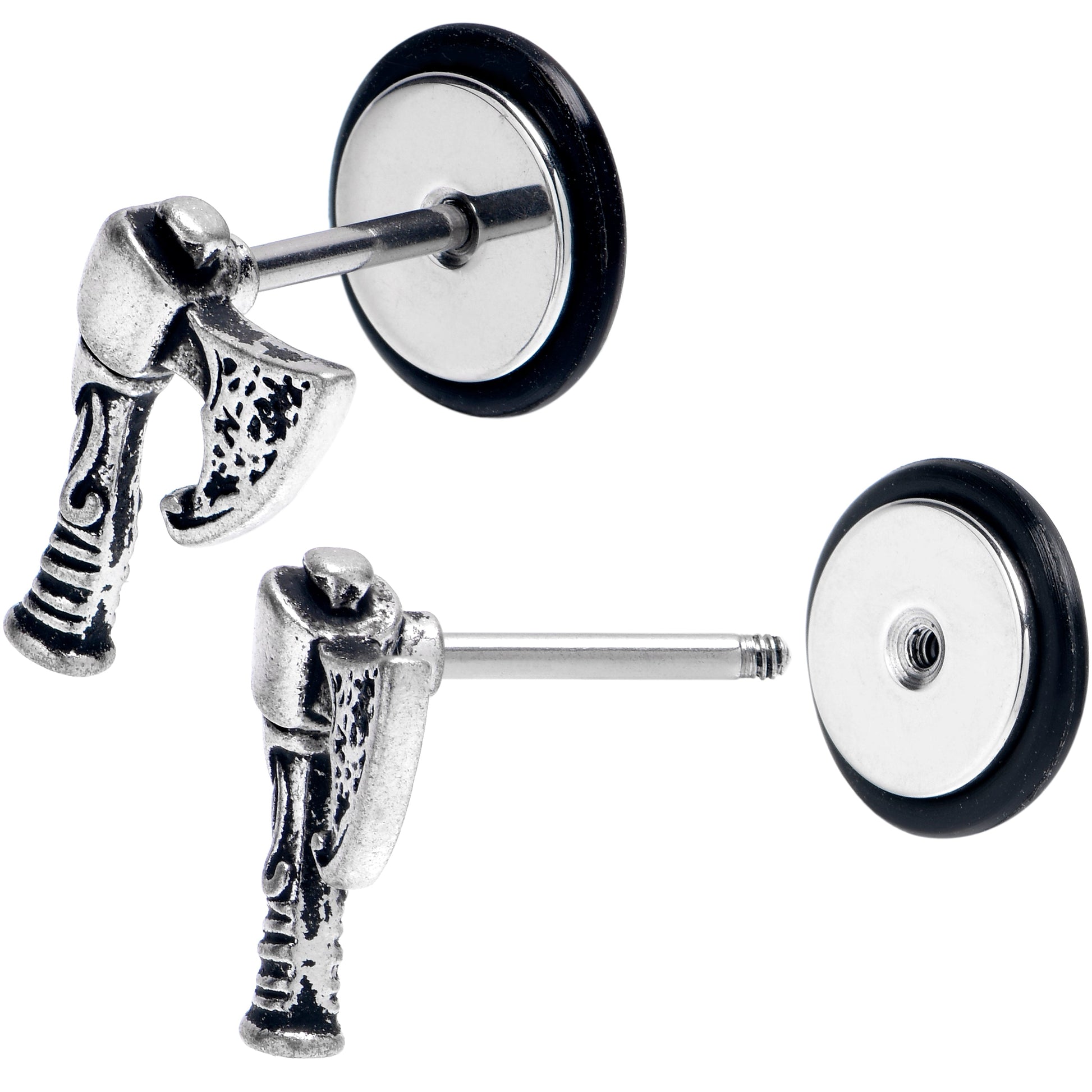 Get the look without the commitment with these trompe l'oeil cheater plugs. They are made with 16 gauge 316L surgical grade stainless steel posts to fit standard or slightly larger sized pierced ear lobes. The front and back feature the look of plugs with no stretching required. The front portions feature antique styled hatchet charms for a look that is super sharp. Get the look without committing to stretched lobes with these awesome axe cheater plugs. Sold as a set of two.Specifications