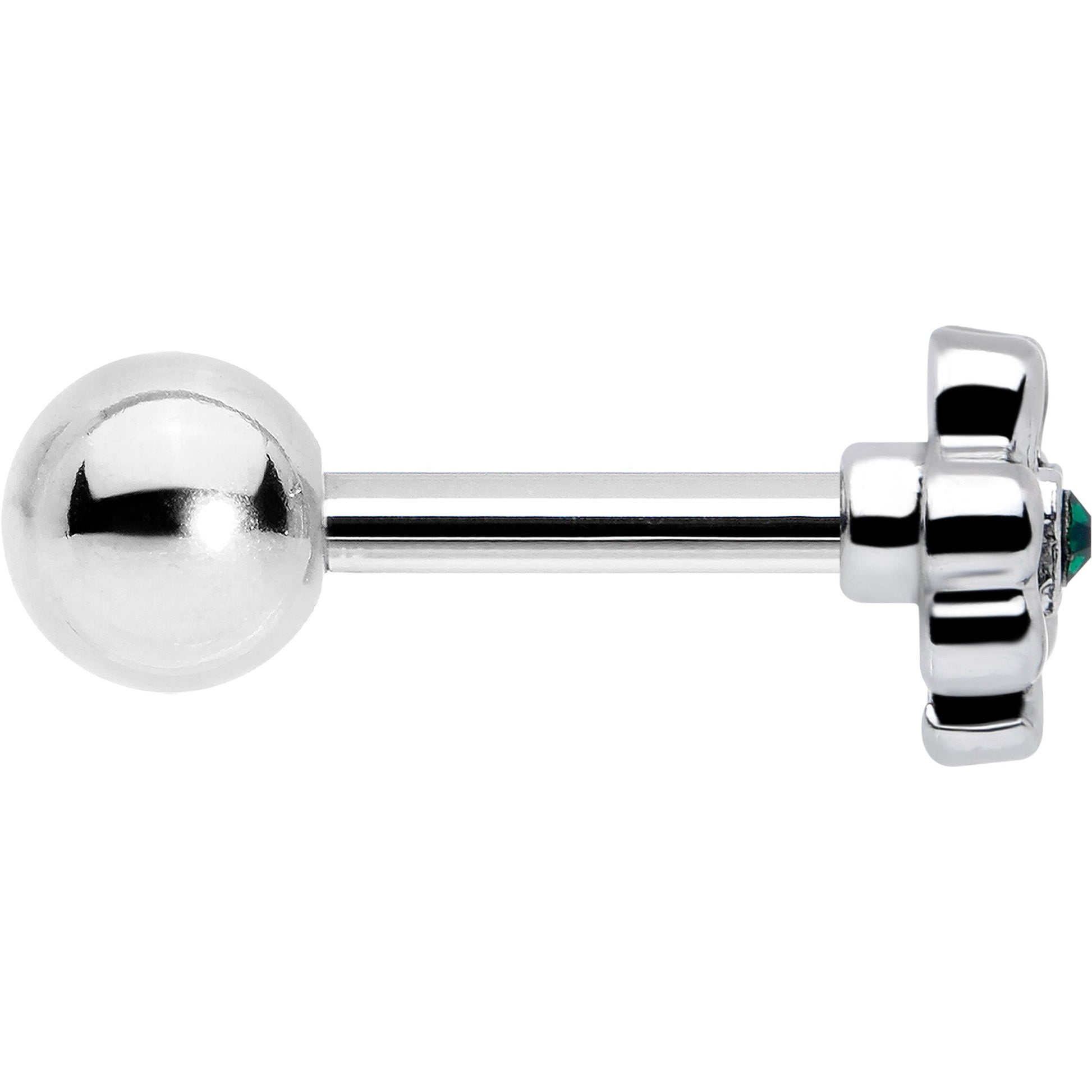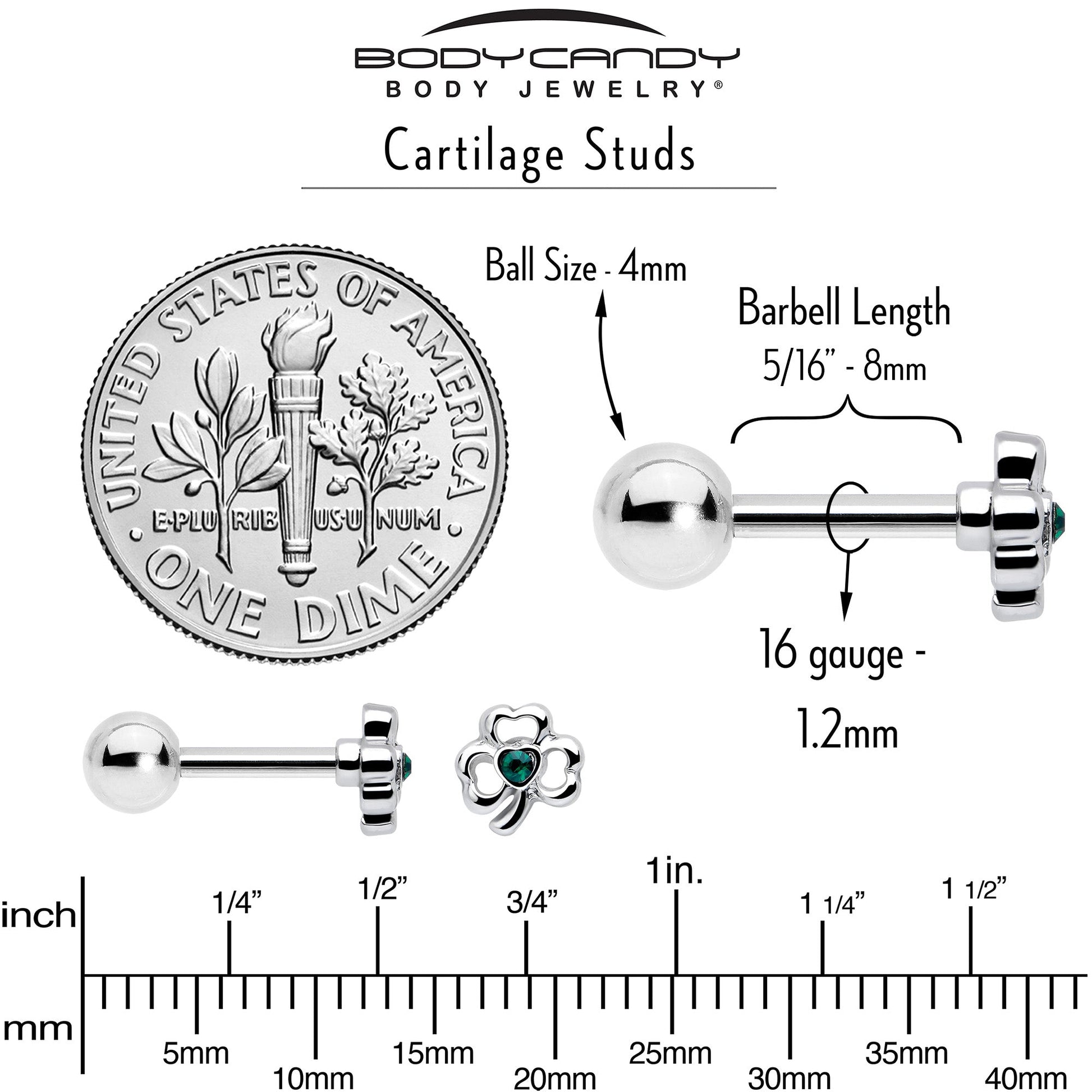 Get lucky with this 16 gauge tragus stud. It's made with an 8mm durable 316L surgical grade stainless steel straight barbell with a 4mm ball end. It features a shamrock with open centered leaves and is embellished with a green gem heart at the center for added color and style. You can even rock it in multiple piercings including tragus, helix, and some conch piercings. Whether you're celebrating St Patrick's Day, expressing your love of all things Irish, or simply need a little luck, this lucky shamrock cartilage piercing jewelry is sure to leave you feeling the love.Specifications