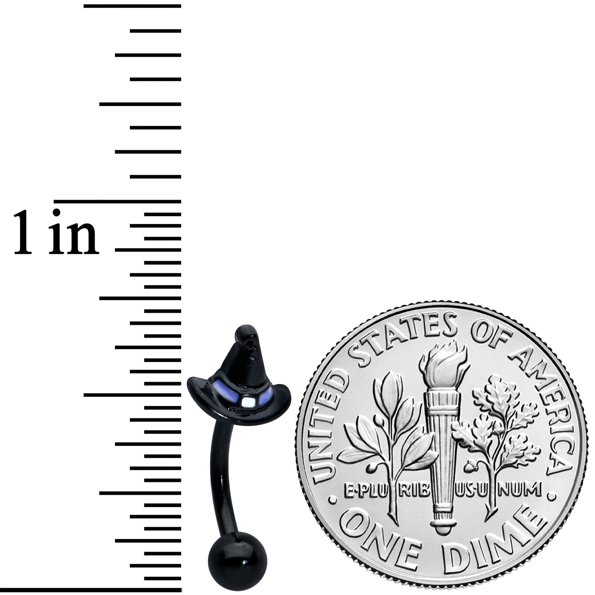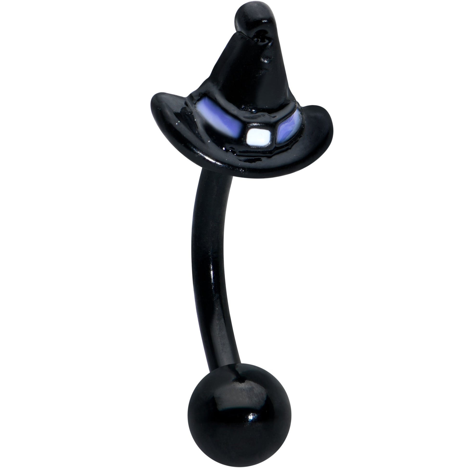 You'll be ready for anything this Halloween with this set of 16 gauge eyebrow rings! Two are made with 8mm durable 316L surgical grade stainless steel curved barbells. One features a pink pearlescent top ball end. The other features a spider charm, with pink gem embellishments and individually detailed legs. The third one is made with an 8mm black PVD over 316L surgical grade stainless steel curved barbell and features a witch's hat charm in black, with a purple hat band embellishment. You can even rock this cartilage jewelry in multiple piercings including tragus, rook, and eyebrow piercings! You'll have your bases covered in style this Halloween with these eerie and elegant cartilage rings! Sold as a set of three.Specifications