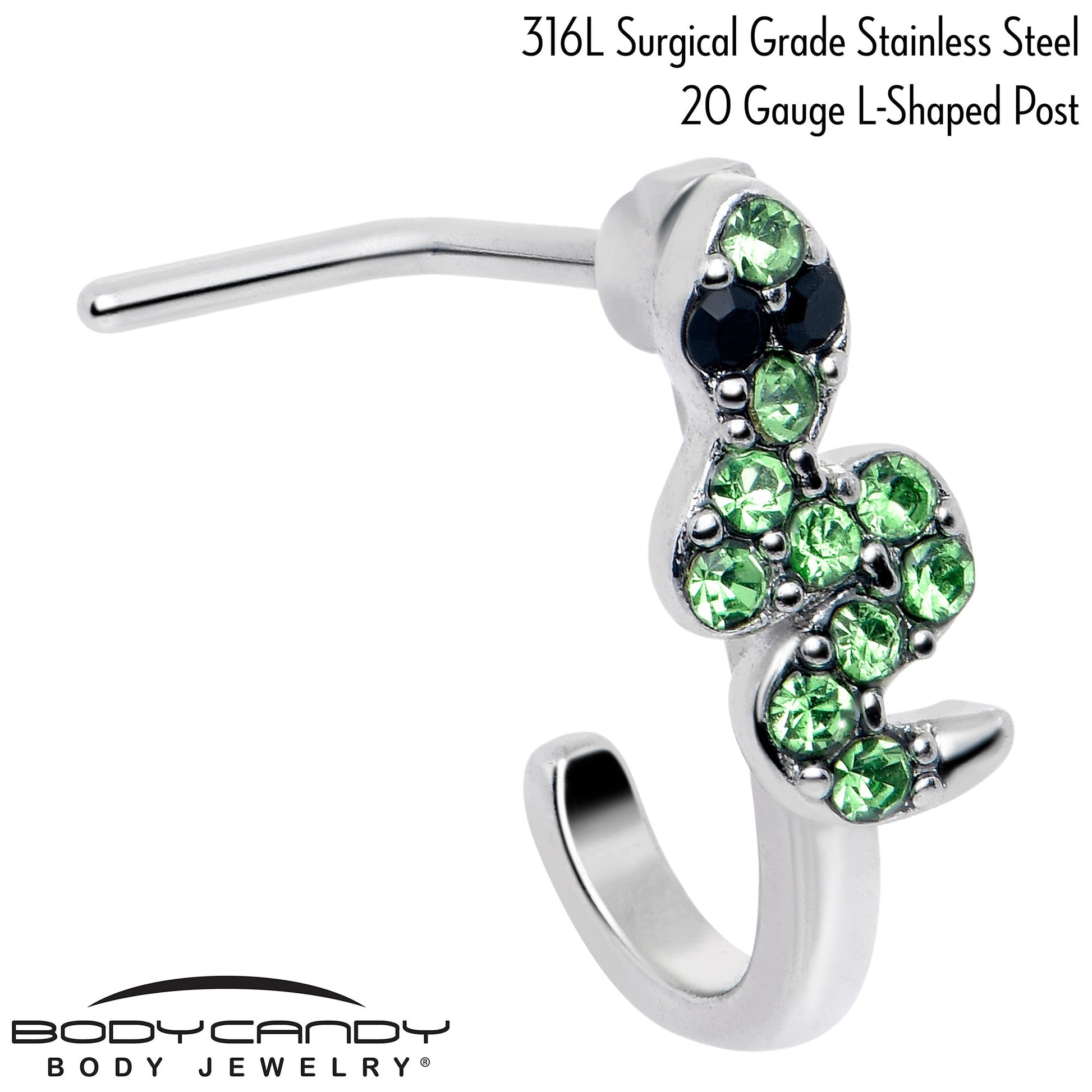 Give yourself a slithery, sexy new look with this 20 gauge nostril ring. It's made with a 0.27 inch length at the bend durable 316L surgical grade stainless steel post and features a curving portion that emulates the look of a hoop while offering the fit of an L-shaped nose ring. It features a curvy little snake charm, set with green gems and embellished with matching black gem eyes. If you are smitten with snakes or or think reptiles rock, this stylish snake nose piercing jewelry is sure to please.Specifications