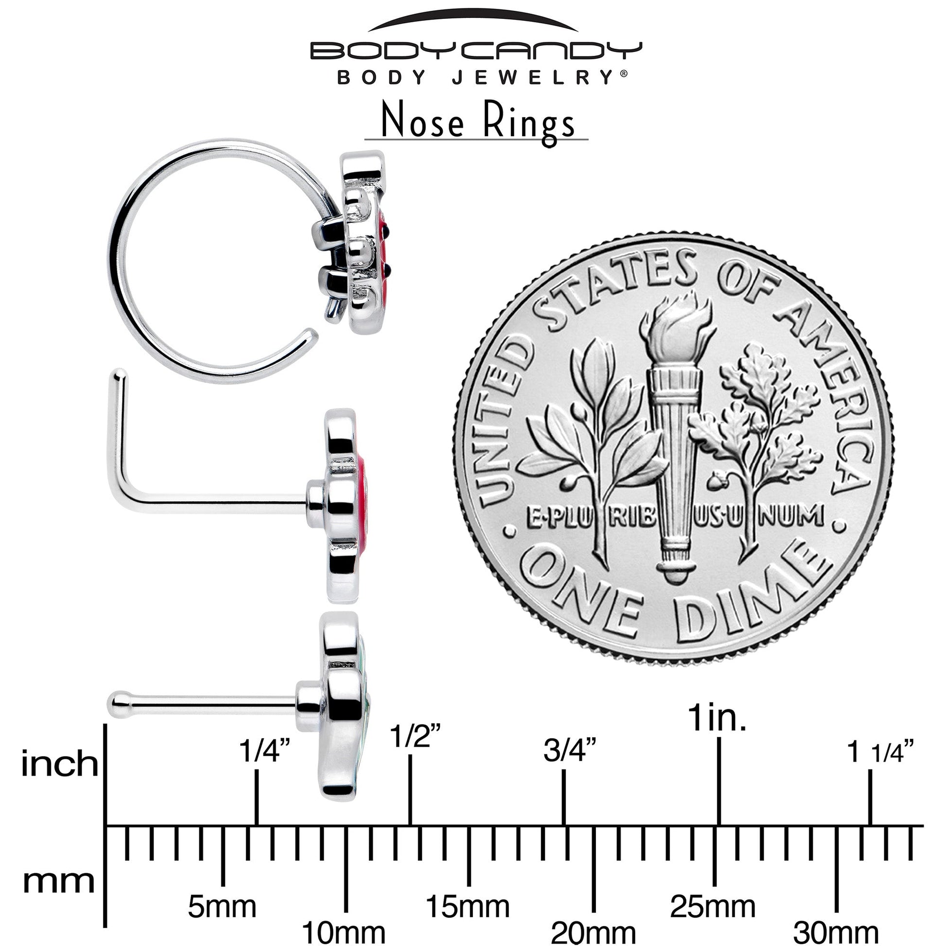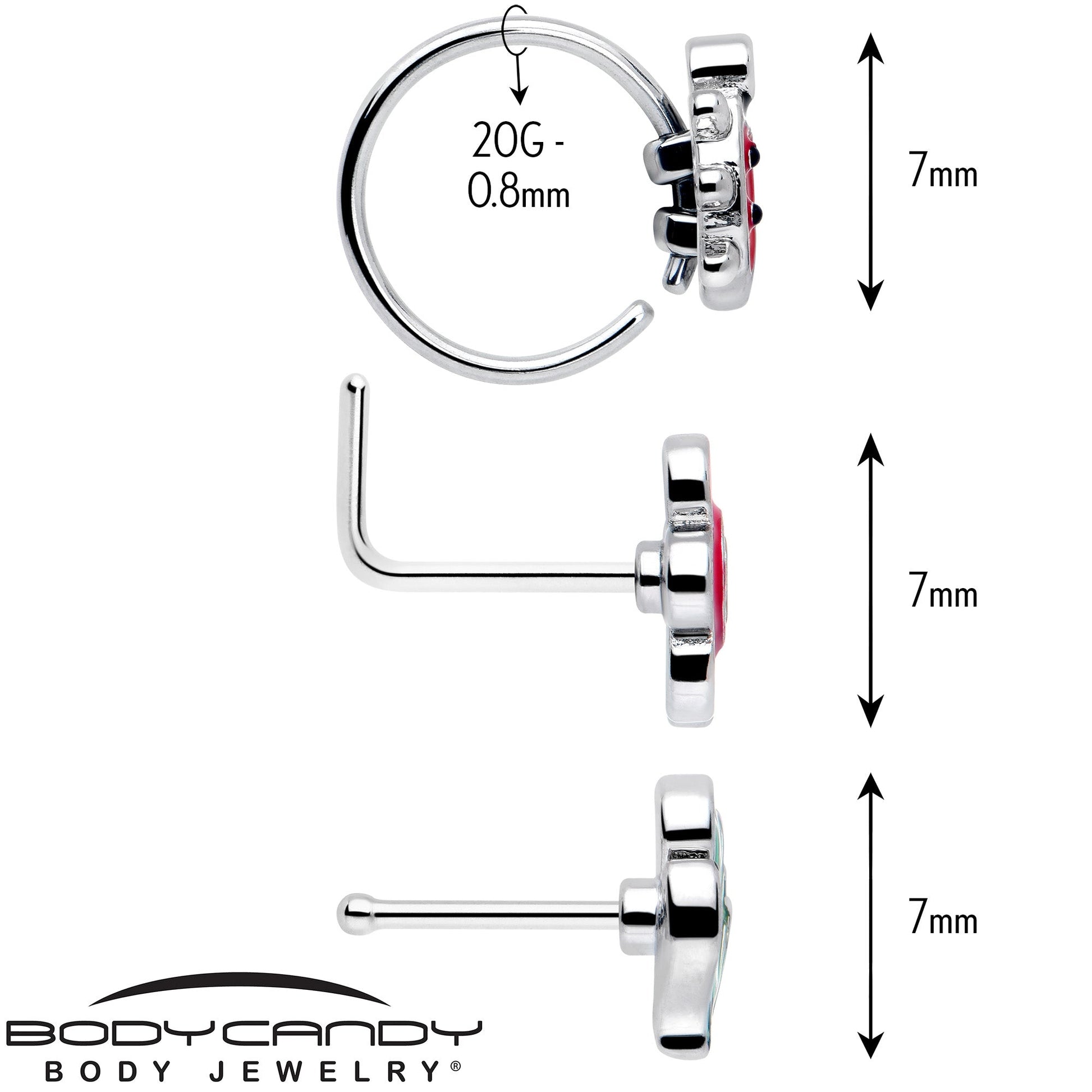 Get a look for every occasion with this set of 20 gauge nostril rings. One is made with a 0.27 inch length at the bend 316L surgical grade stainless steel L-shaped post and features a simple flower charm, with red petals and a happy smiling face on its yellow center. The second one is made with an 8mm 316L surgical grade stainless steel circular ring and features a whimsical ladybug charm, embellished with red inlay and black spots for a more realistic appearance. The third is made with a 6mm durable 316L surgical grade stainless steel straight post and features a simple green leaf charm with textured detailing. You will be ready for anything with this nose piercing jewelry. Sold as a set of three.Specifications