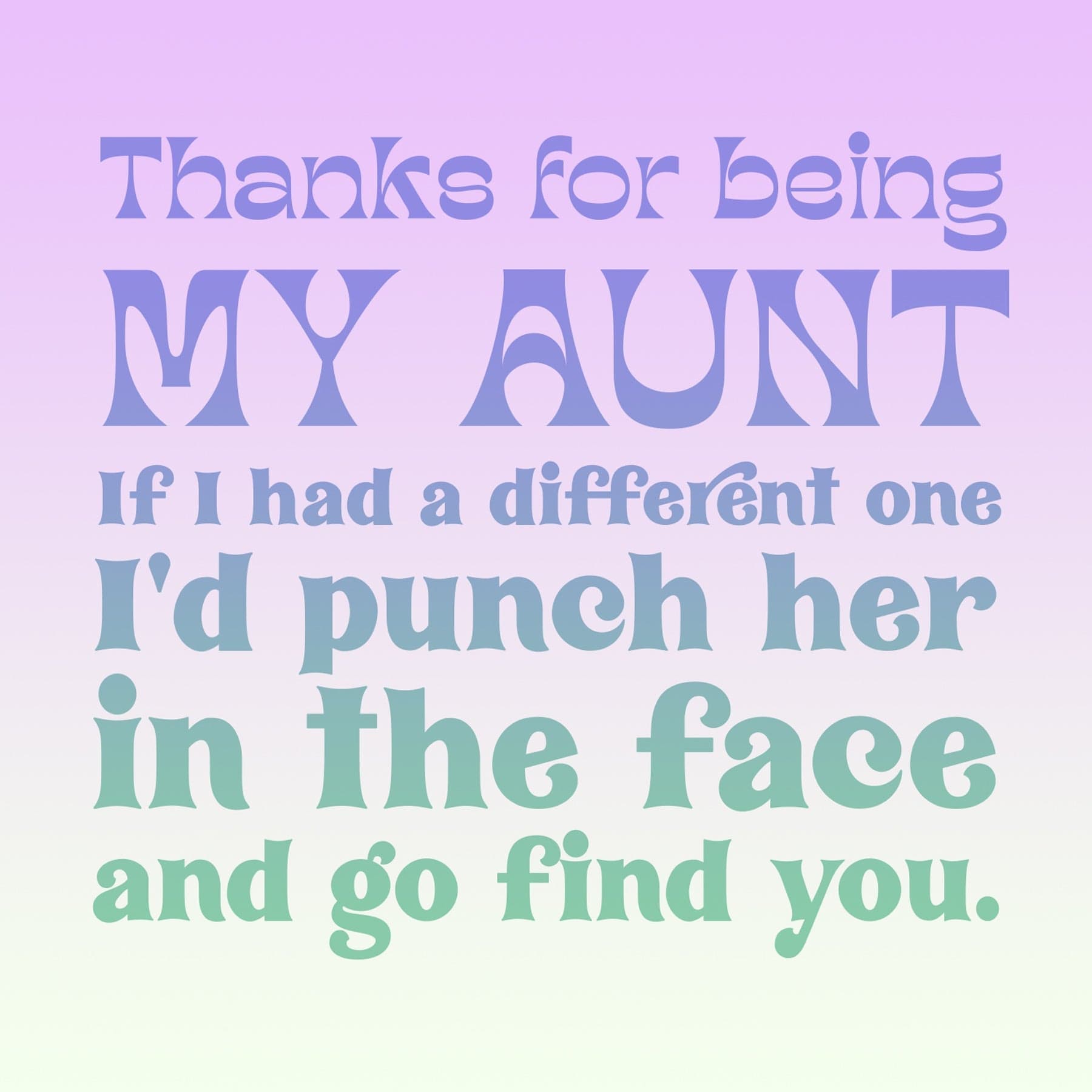 Aunt Quote: Thanks for being MY AUNT If I had a different one I'd punch her in the face and go find you.