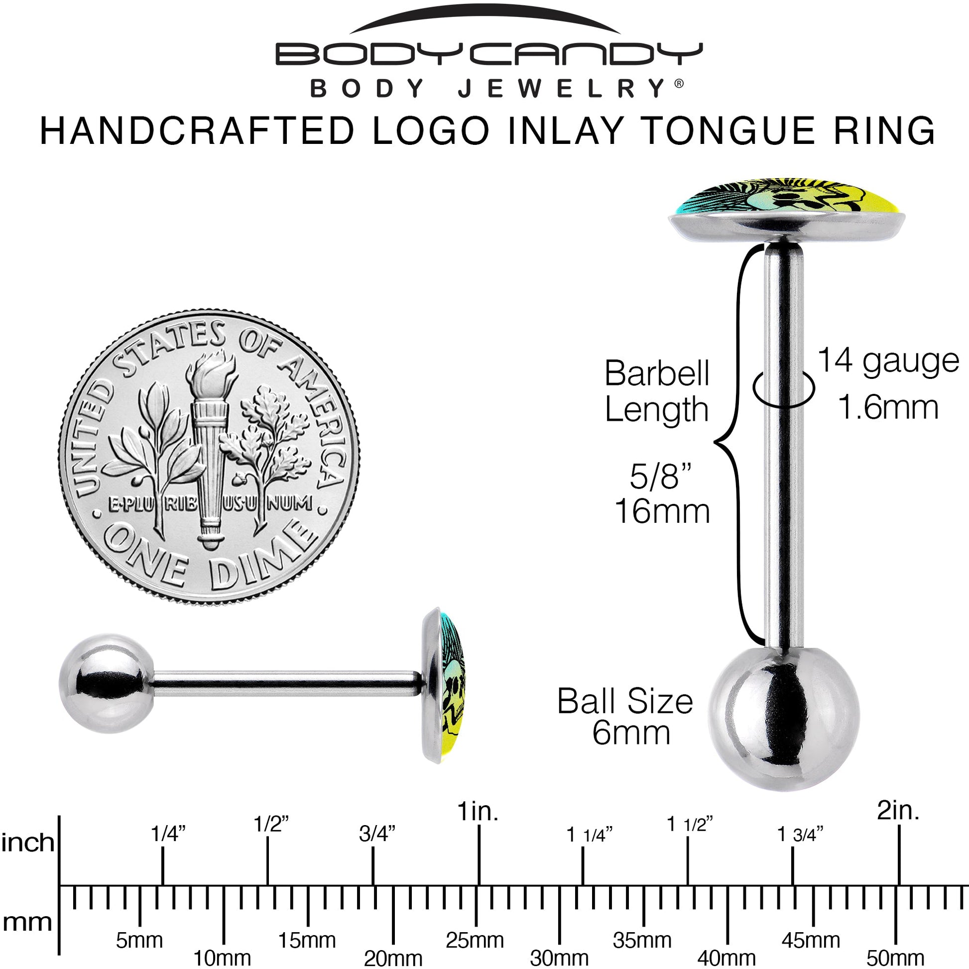 Add some palmy desert style to your look with a creepy twist when you're rocking this 14 gauge tongue barbell. It's made with a 5/8 inch 316L surgical grade stainless steel straight barbell with a 6mm bottom ball end. The top end features a logo disc charm of a silhouetted desert with a blue sky, yellow sand, and silhouetted palm fronds. At the center is a simple skull, adding a touch of eerie style to an otherwise peaceful scene. Let your look rest in peace with this sunset skull tongue piercing jewelry.