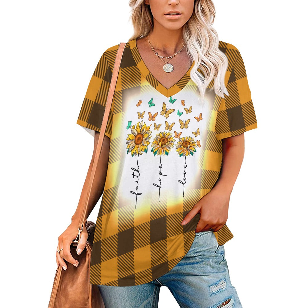 Buffalo Plaid Faith Hope Love V-Neck Loose Short Sleeve T-Shirt