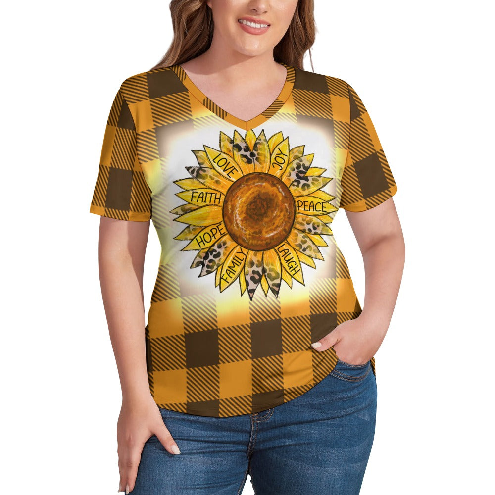 Buffalo Plaid Sunflower V-Neck Loose Short Sleeve T-Shirt