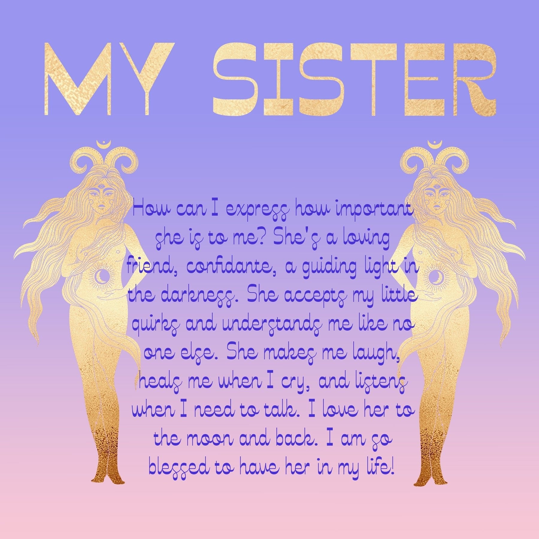 Christmas Gift for Sister Quote: How can I express how important she is to me? She's a loving friend, confidante, a guiding light in the darkness. She accepts my little quirks and understanding me like no one else. She makes me laugh, heals me when I cry, and listens when I need to talk. I loved her to the moon and back. I am so blessed to have her in my life!