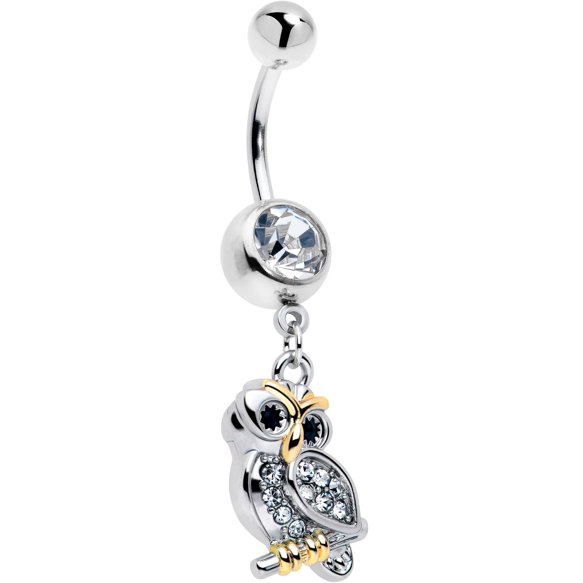 If only all the owls looked as elegant as the one on this 14 gauge navel ring. It's made with a 3/8 inch 316L surgical grade stainless steel curved barbell with a 5mm top ball end. The bottom ball end is 8mm and set with a large, clear gem. Dangling beneath it is an owl charm with clear gems. It also features gold tone embellishment for a truly striking combination of forest and fancy that's sure to attract attention. When you're rocking this elegant evening owl belly piercing jewelry, you're sure to look like avian aristocracy.Specifications
