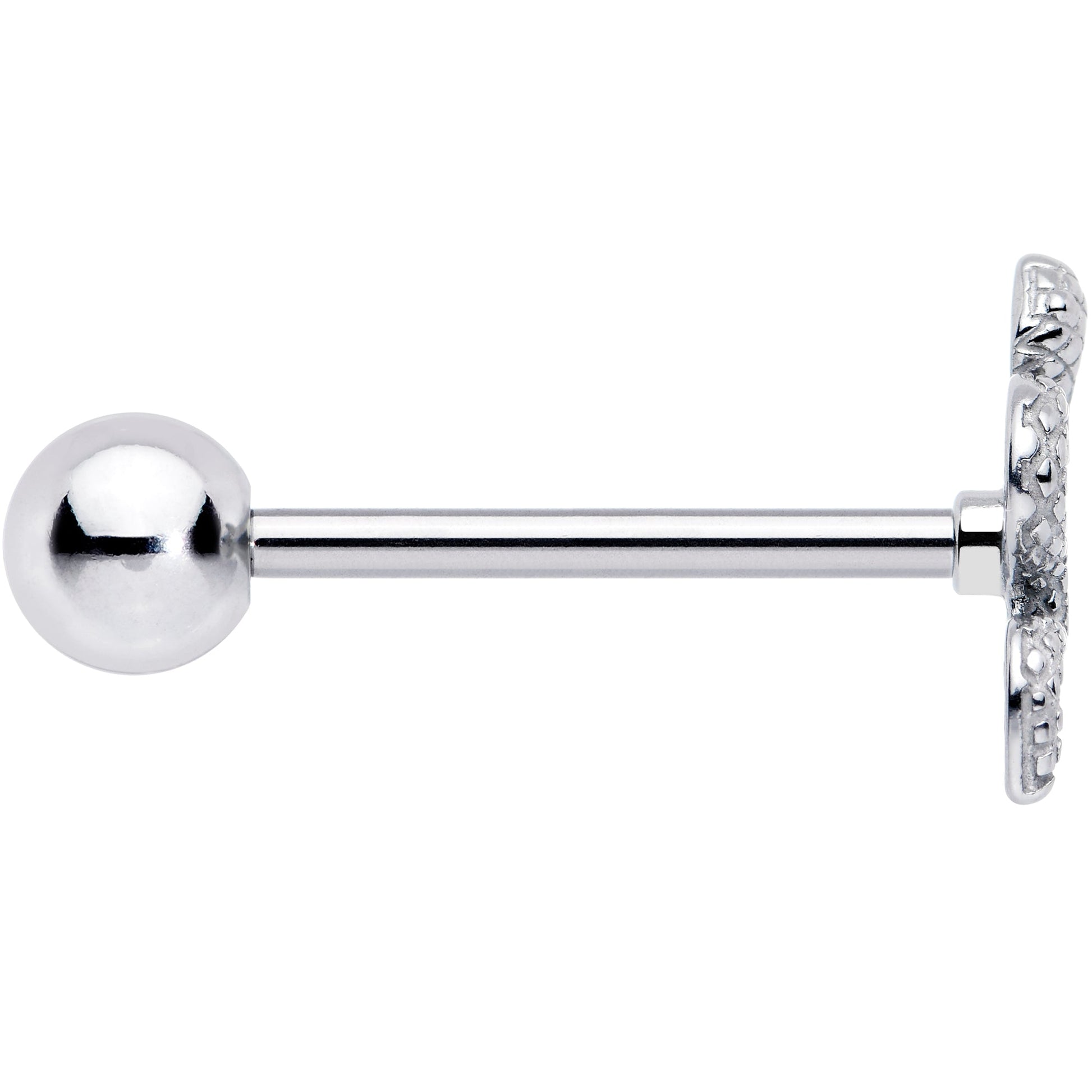 Slither into classic style with this 14 gauge tongue jewelry. It is made with a 5/8 inch 316L surgical grade stainless steel straight barbell with a 6mm bottom ball end. The top end features a slithering snake charm with textured embellishment. If you prefer your style on the creepy crawly side, you can look endlessly elegant with this gorgeous tongue piercing ring.Specifications