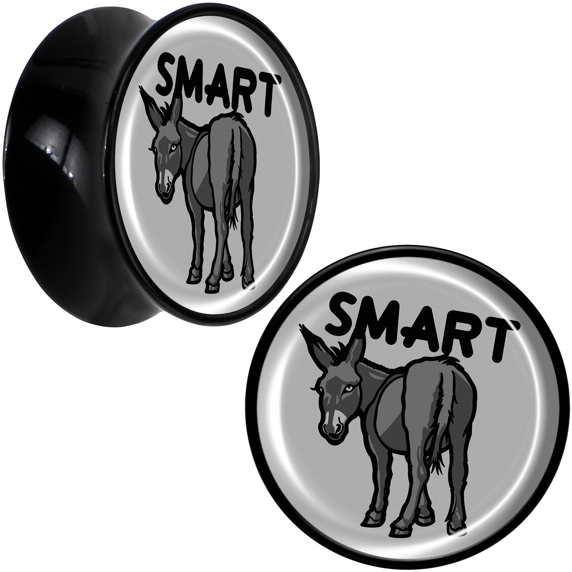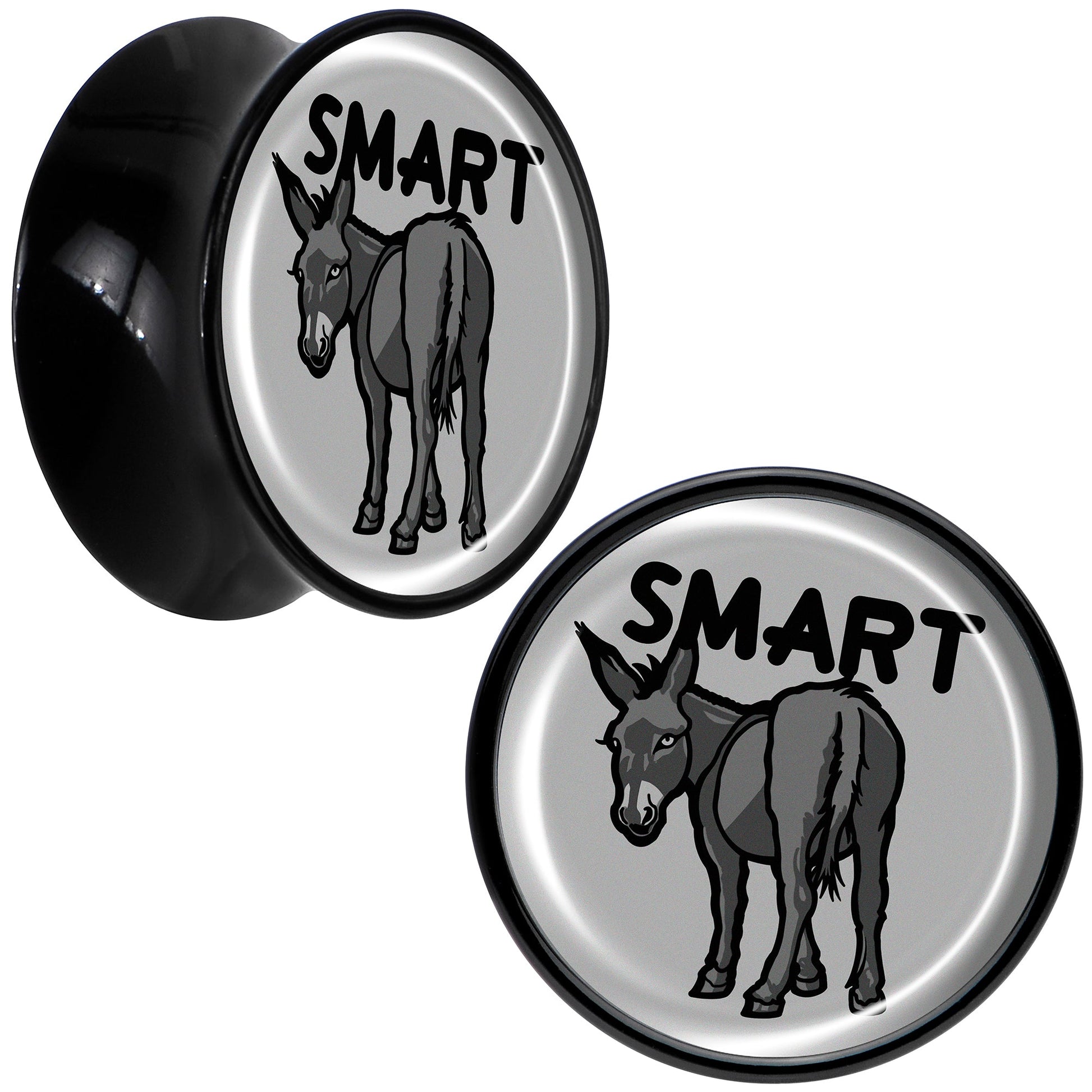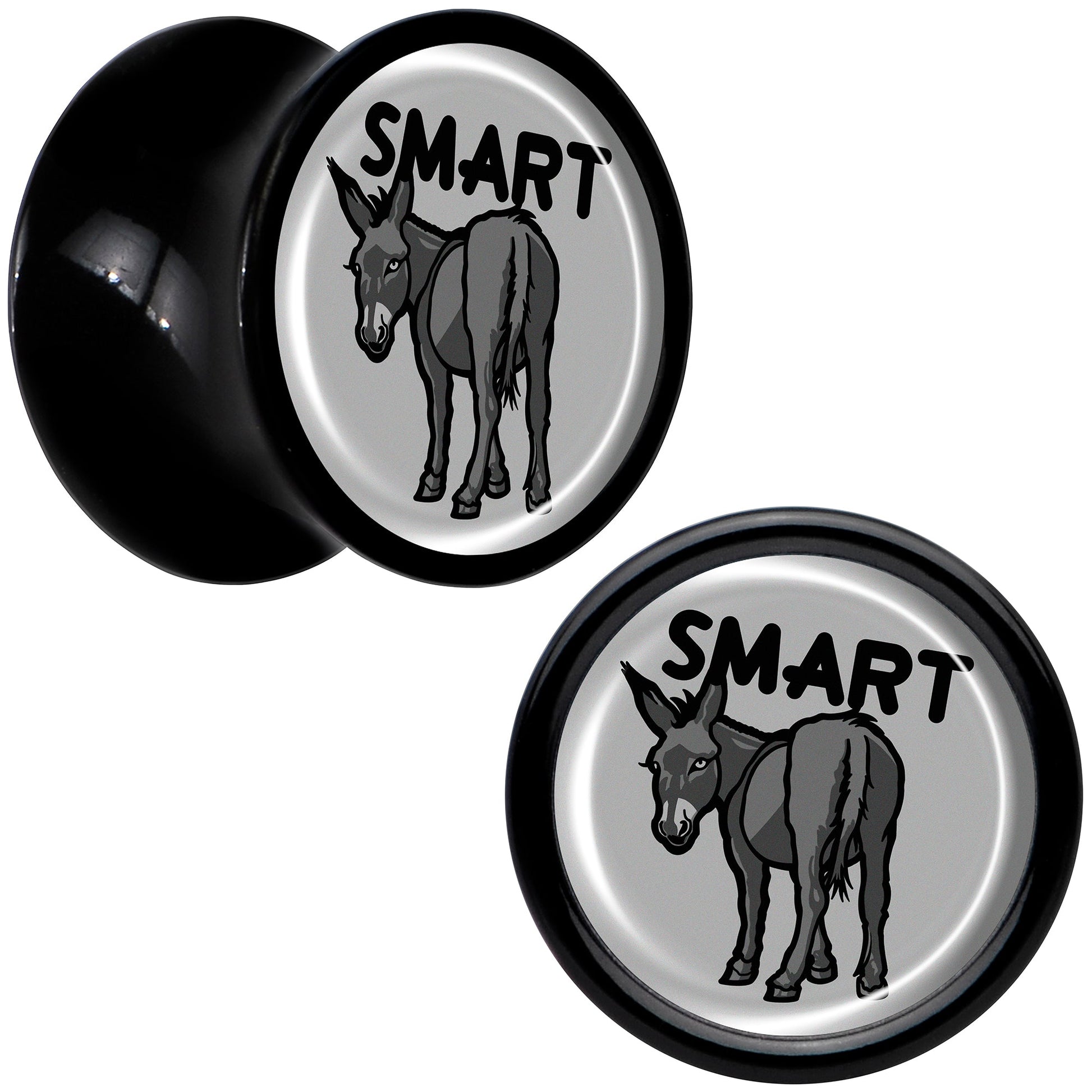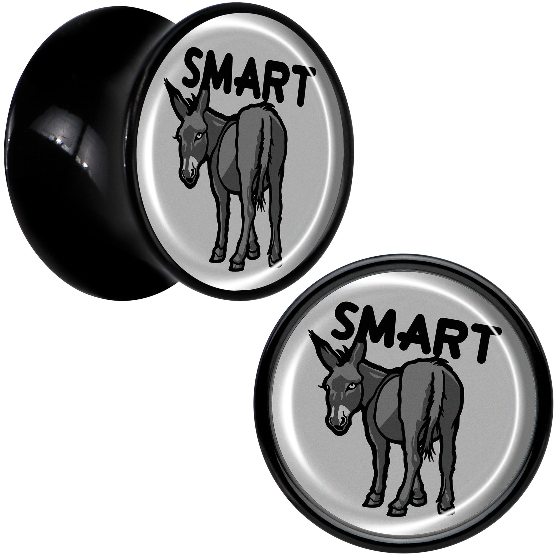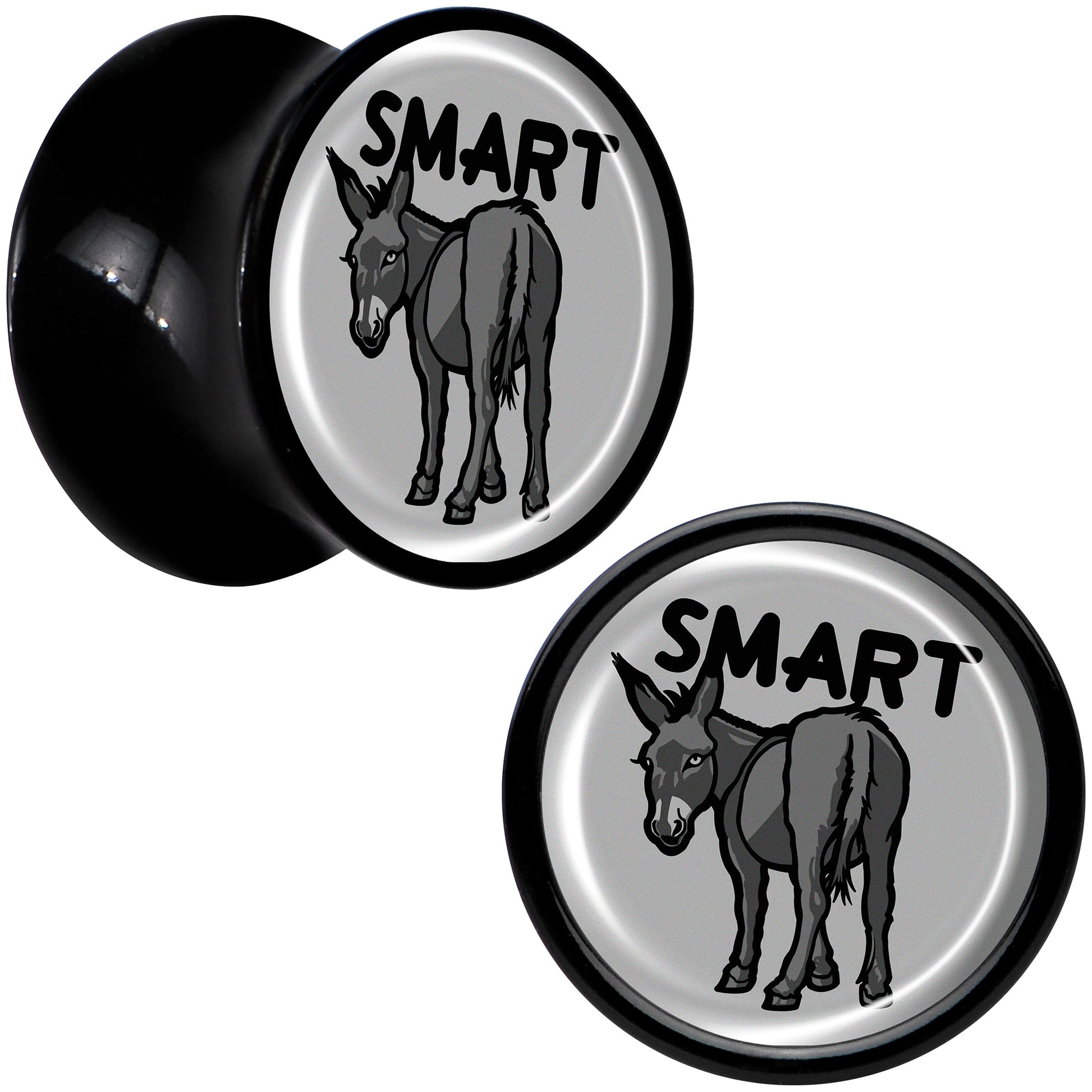Give your look some sass with the smart ass on these saddle plugs for pierced lobes. They're made with acrylic and feature a saddle design for comfortable insertion and removal. Each one features a grey disc charm. One each one is a donkey with a the word "smart" over it, for a clever bit of wordplay that's sure to get some laughs. Get some smartass style with the delightful donkeys on these ear gauges. Sold as a set of two.