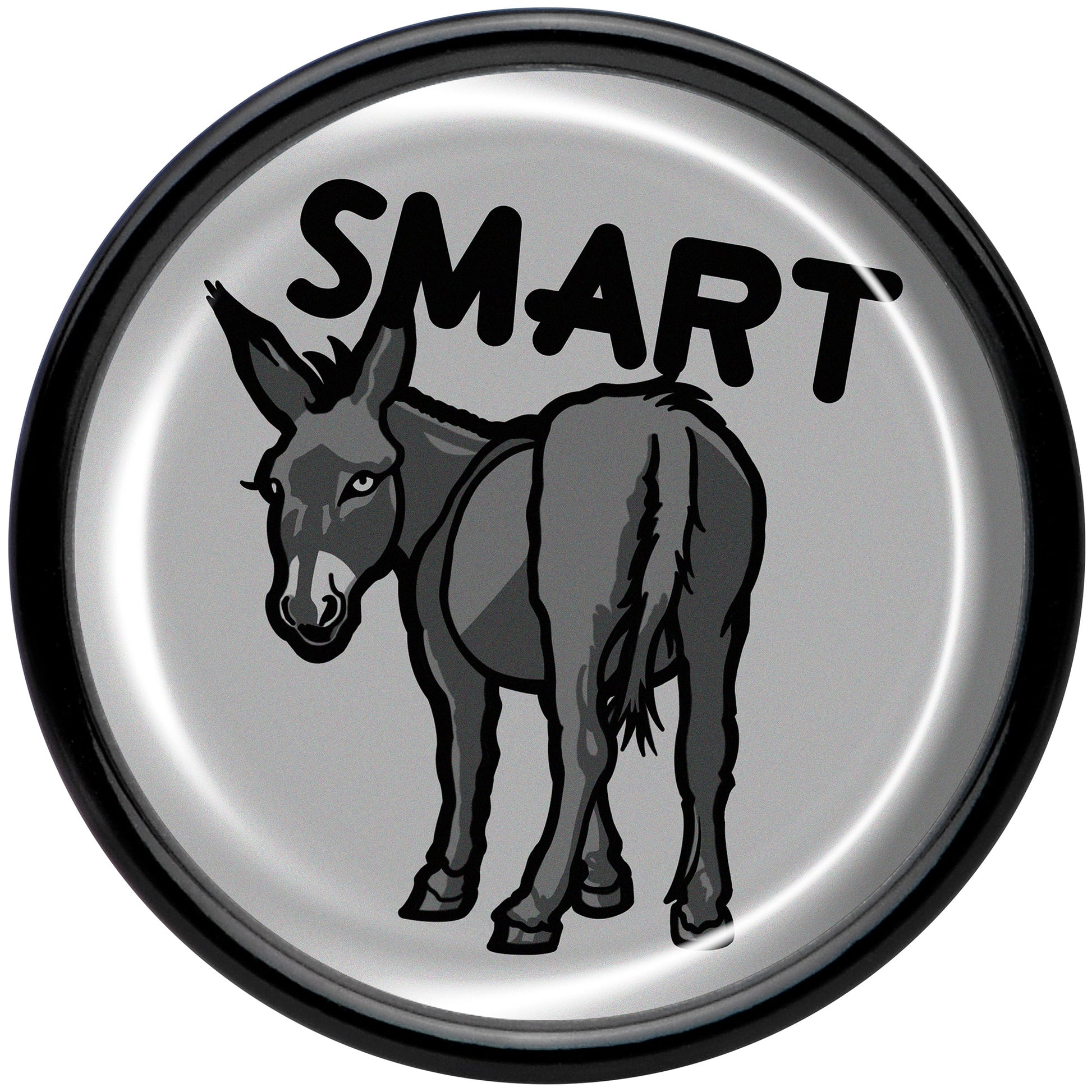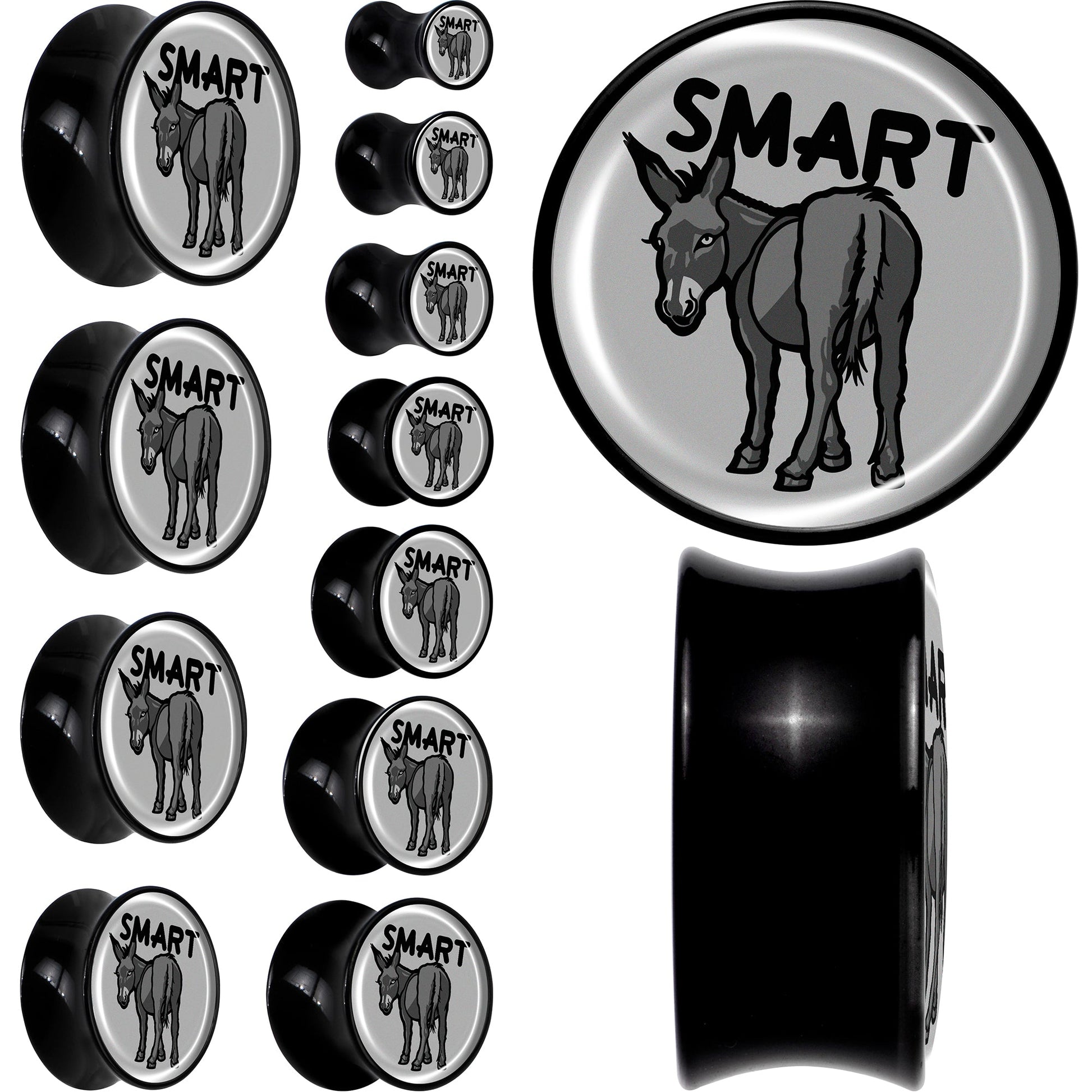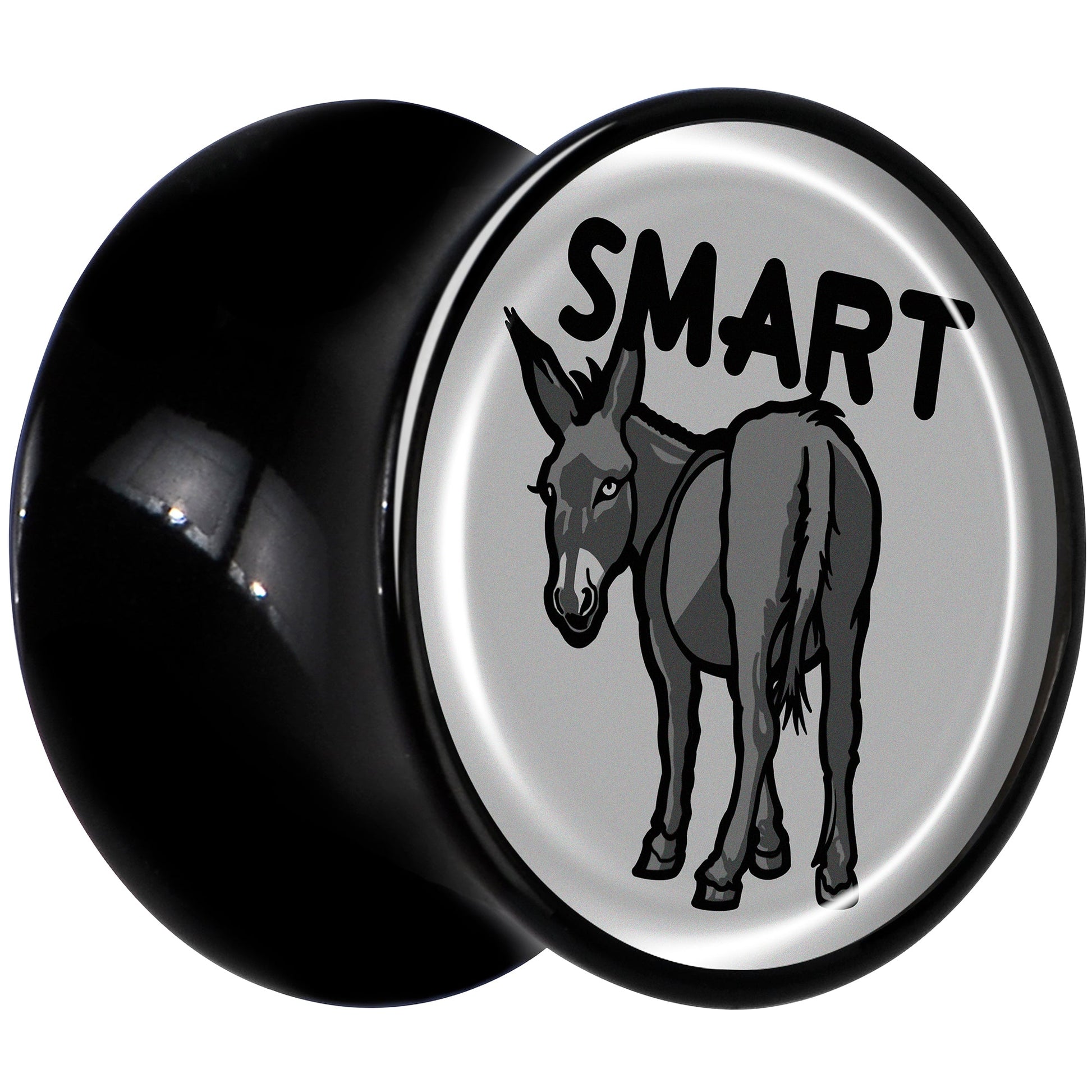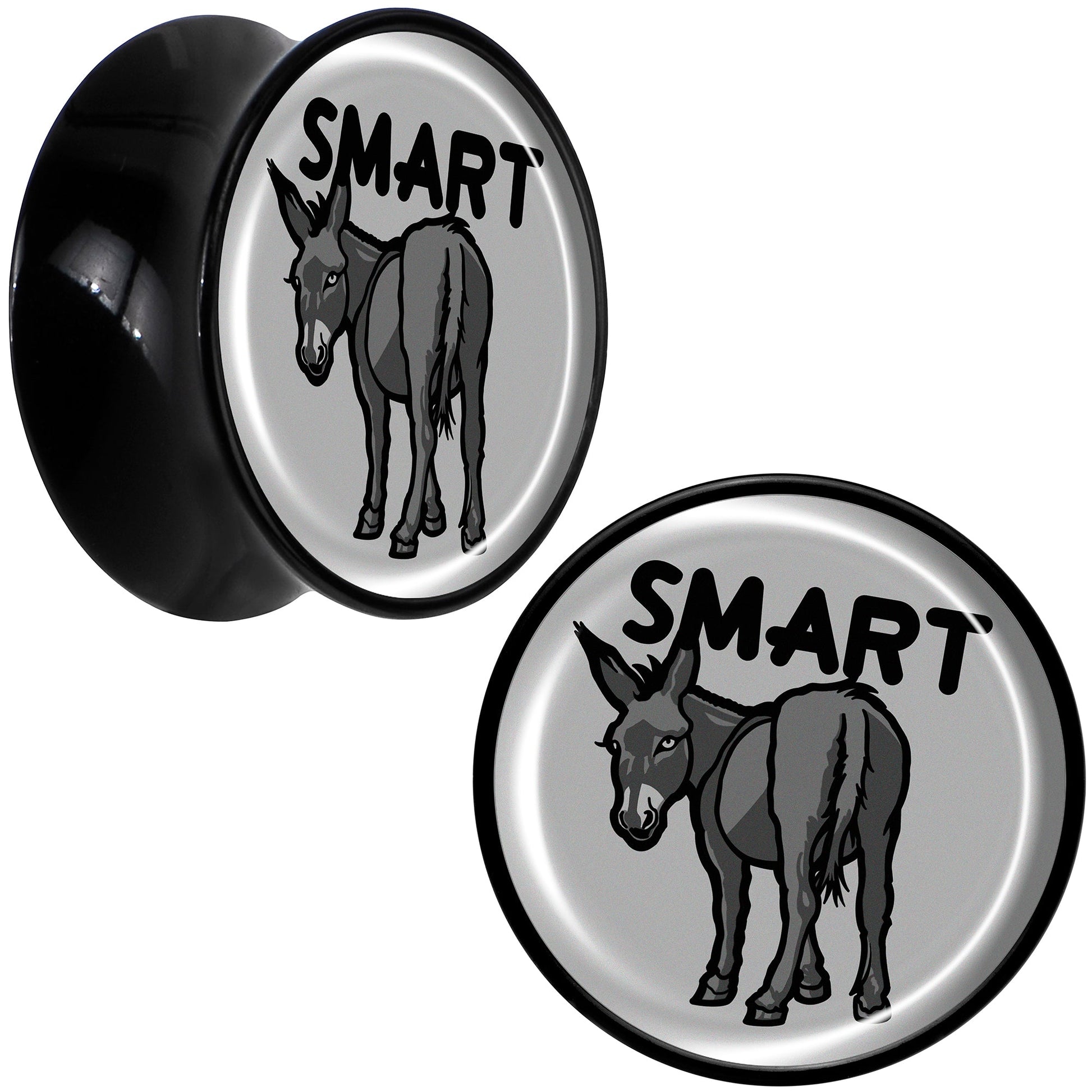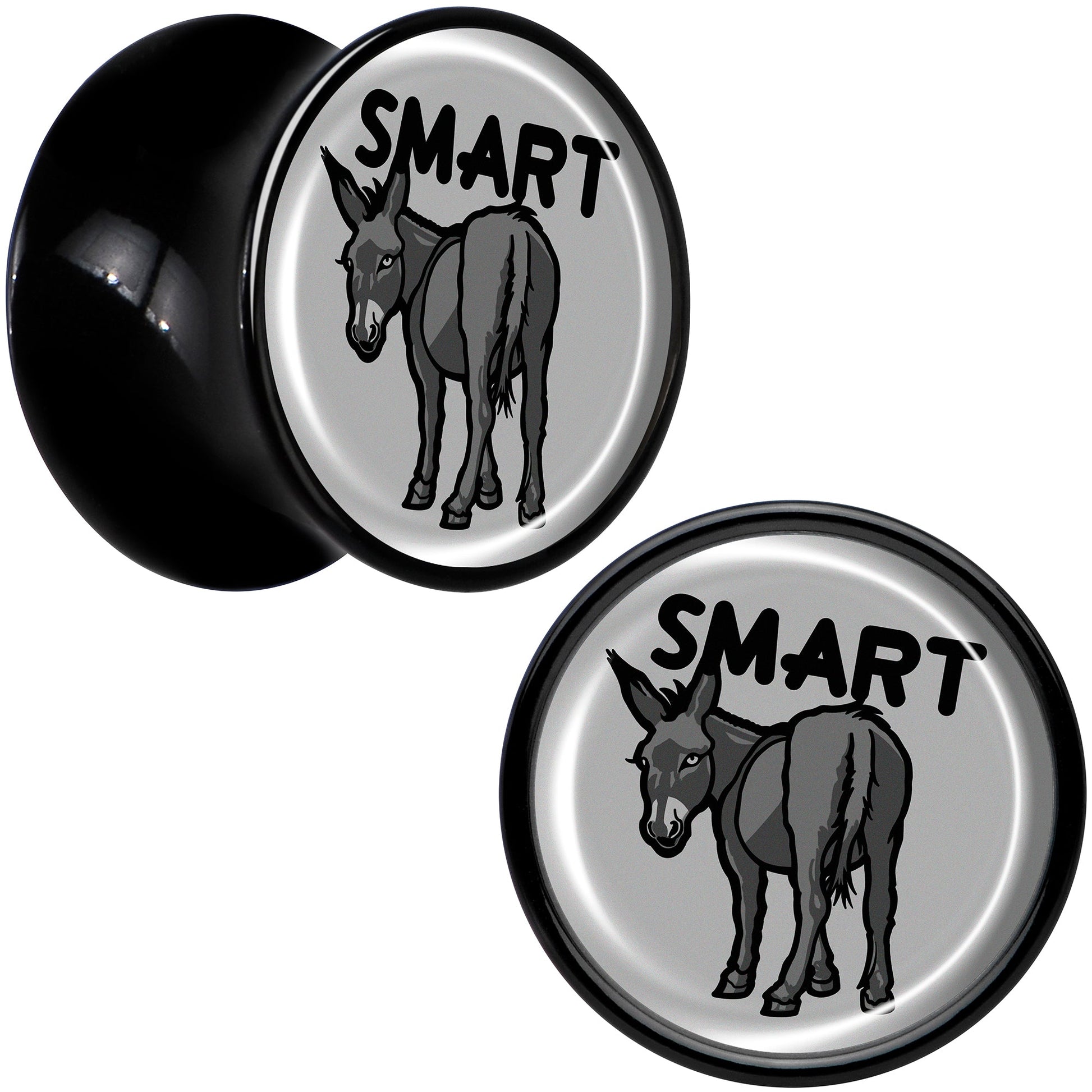 Give your look some sass with the smart ass on these saddle plugs for pierced lobes. They're made with acrylic and feature a saddle design for comfortable insertion and removal. Each one features a grey disc charm. One each one is a donkey with a the word "smart" over it, for a clever bit of wordplay that's sure to get some laughs. Get some smartass style with the delightful donkeys on these ear gauges. Sold as a set of two.