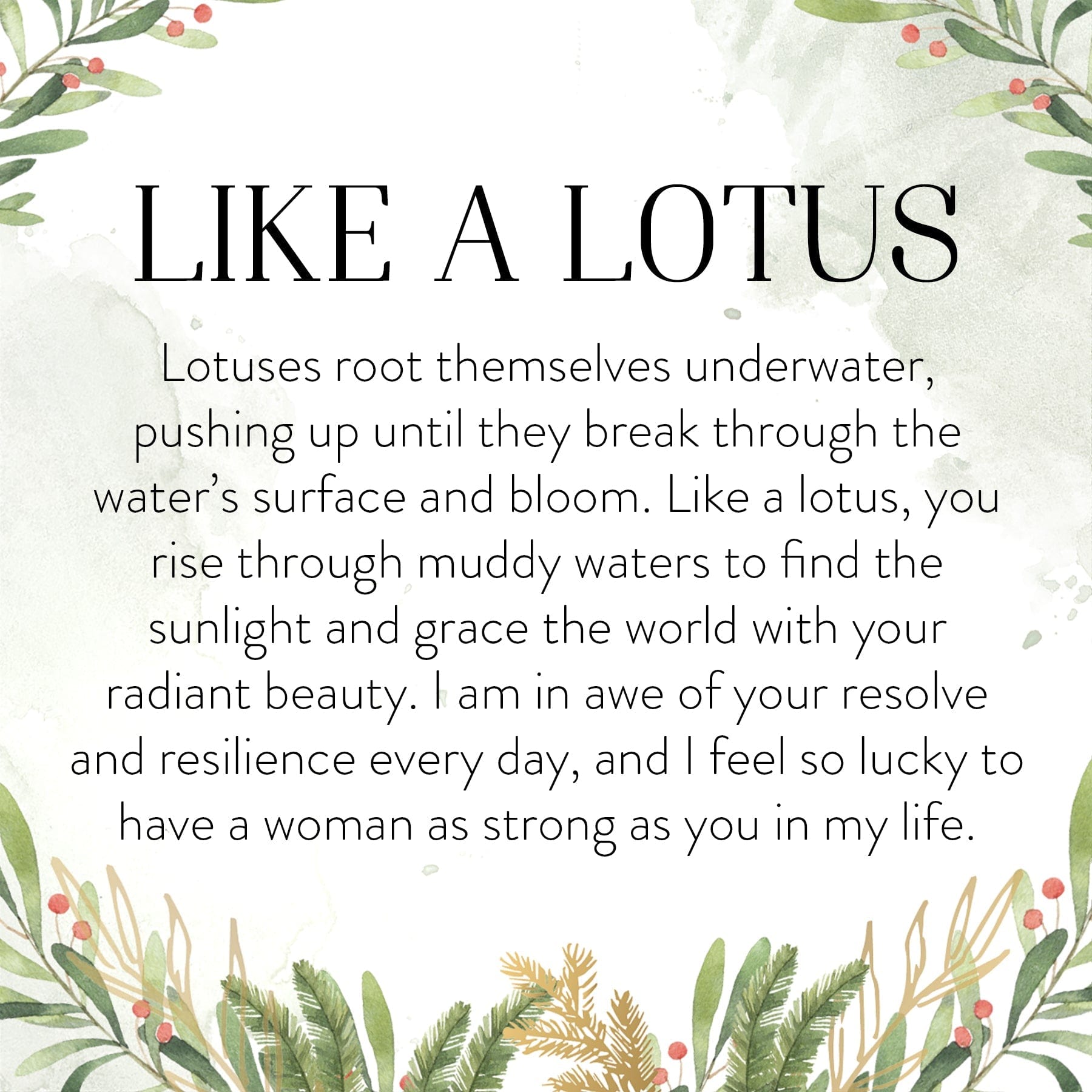 Gifts for Women with Cancer Quote: Lotuses root themselves underwater, pushing up until they break through the water’s surface and bloom. Like a lotus, you rise through muddy waters to find the sunlight and grace the world with your radiant beauty. I am in awe of your resolve and resilience every day, and I feel so lucky to have a woman as strong as you in my life.