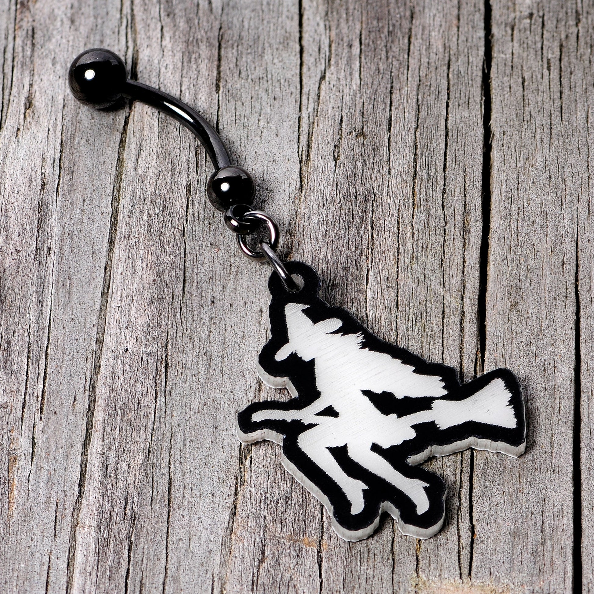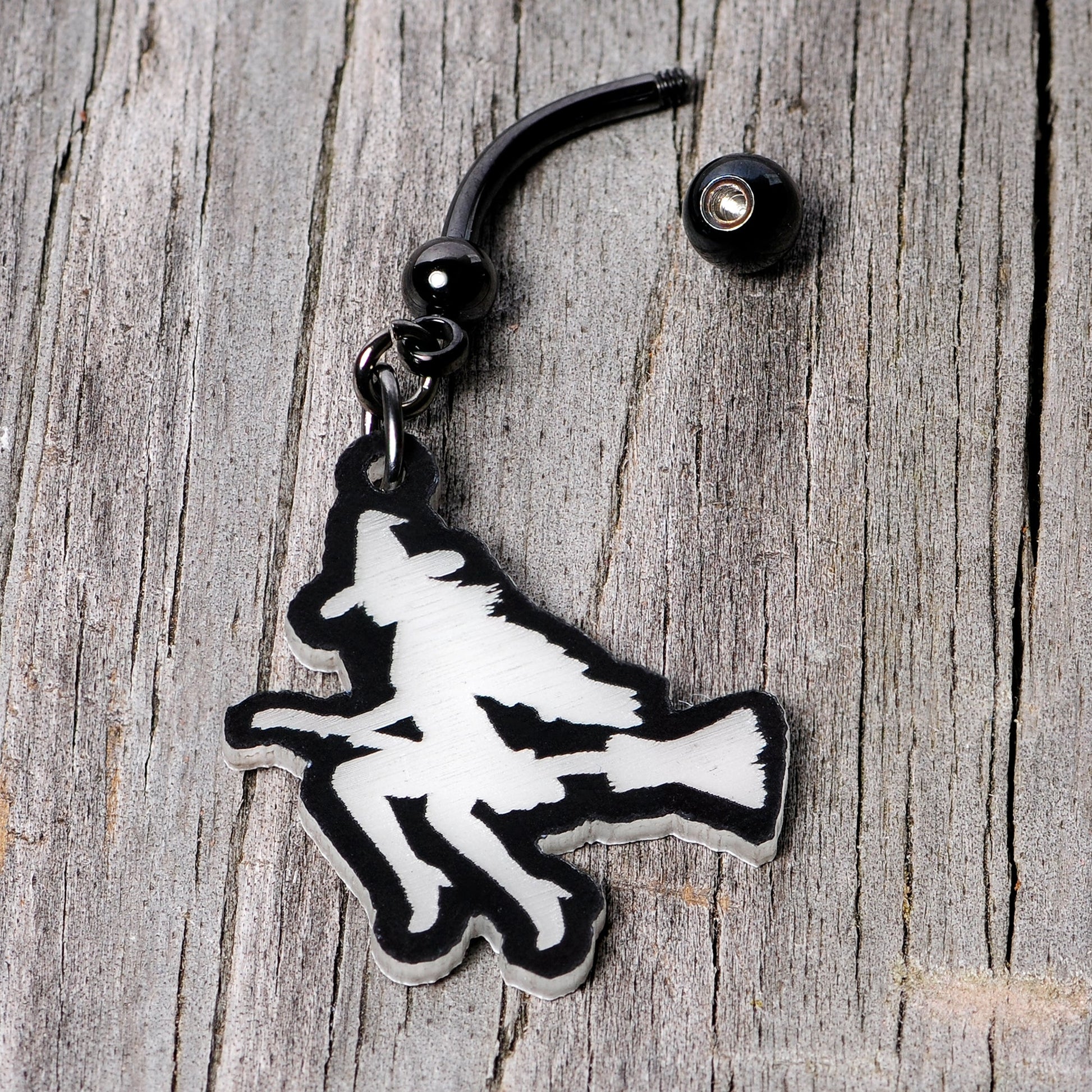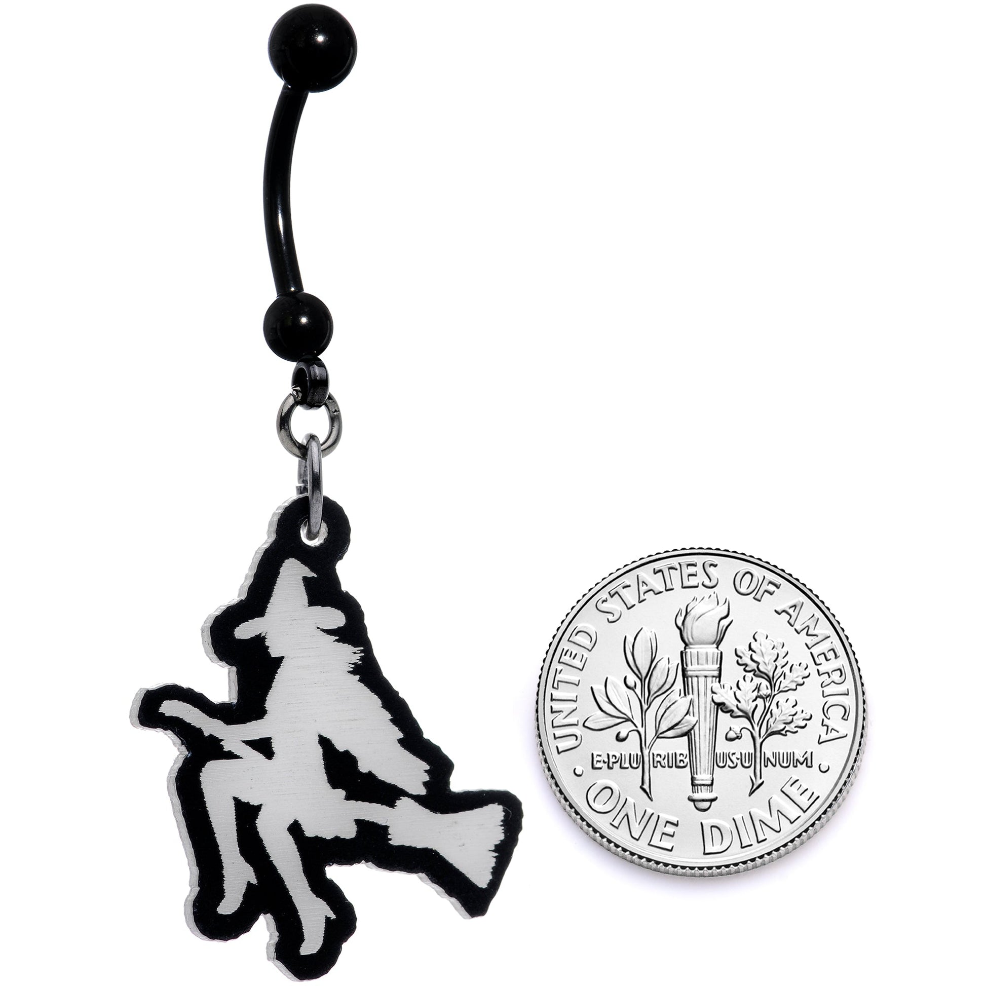 Take off into the night sky with this Halloween witch belly button ring. This witch on broom navel piercing features an anodized titanium over 316L surgical steel curved barbell and glow dangle charm. Glow in the dark belly ring. Halloween body jewelrySpecifications