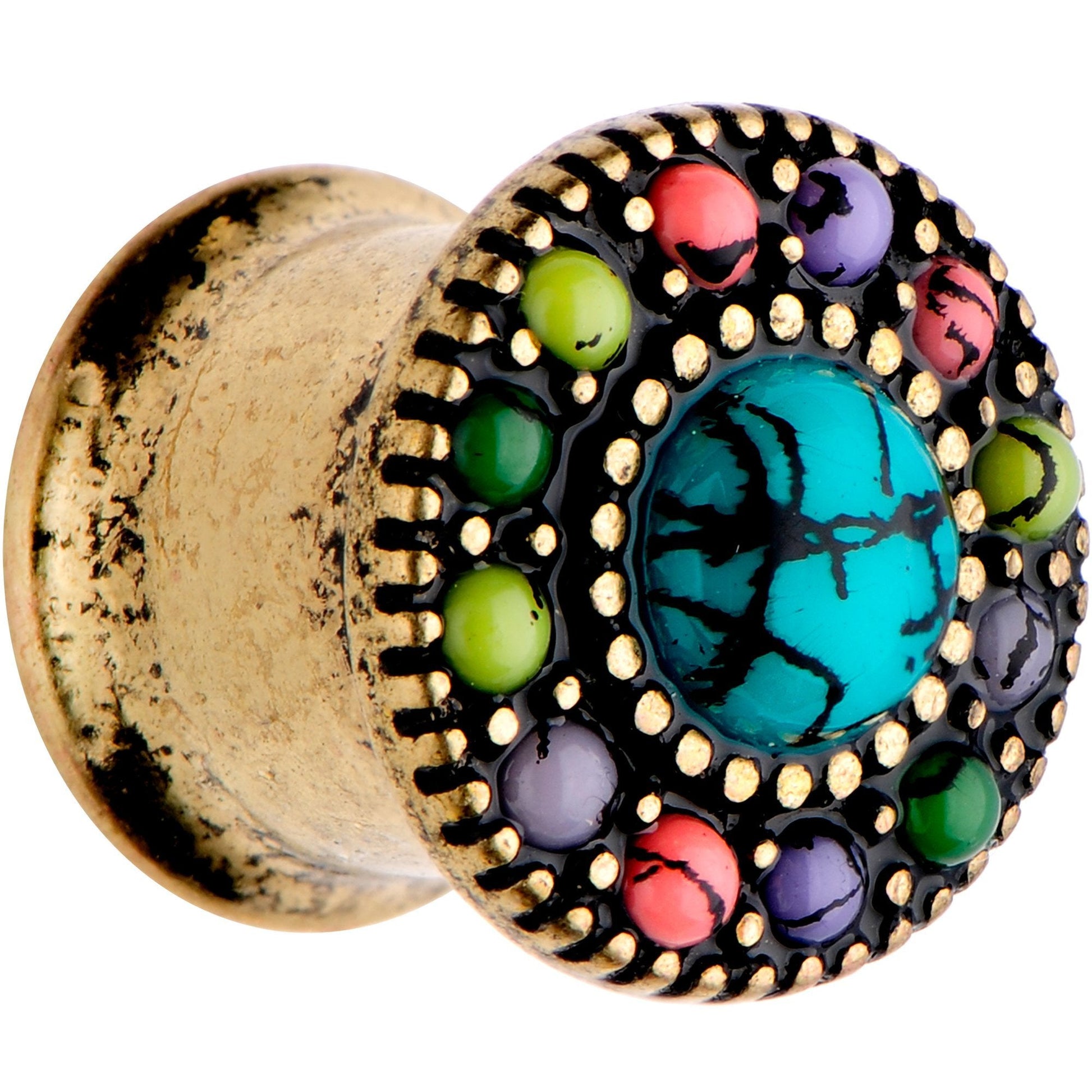 Covered in a variety of ancient-looking smooth rounded orbs, these double flare tunnel plugs are straight out of the stone age! Purple, pink, and green orbs surround a large blue central orb on these double flare tunnel plugs made with gold plated over durable 316L surgical grade stainless steel. Sold as a set of two for you!