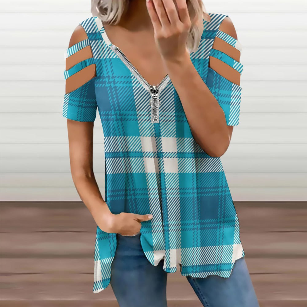Ladies Blue Plaid BE Zip Off Shoulder Top