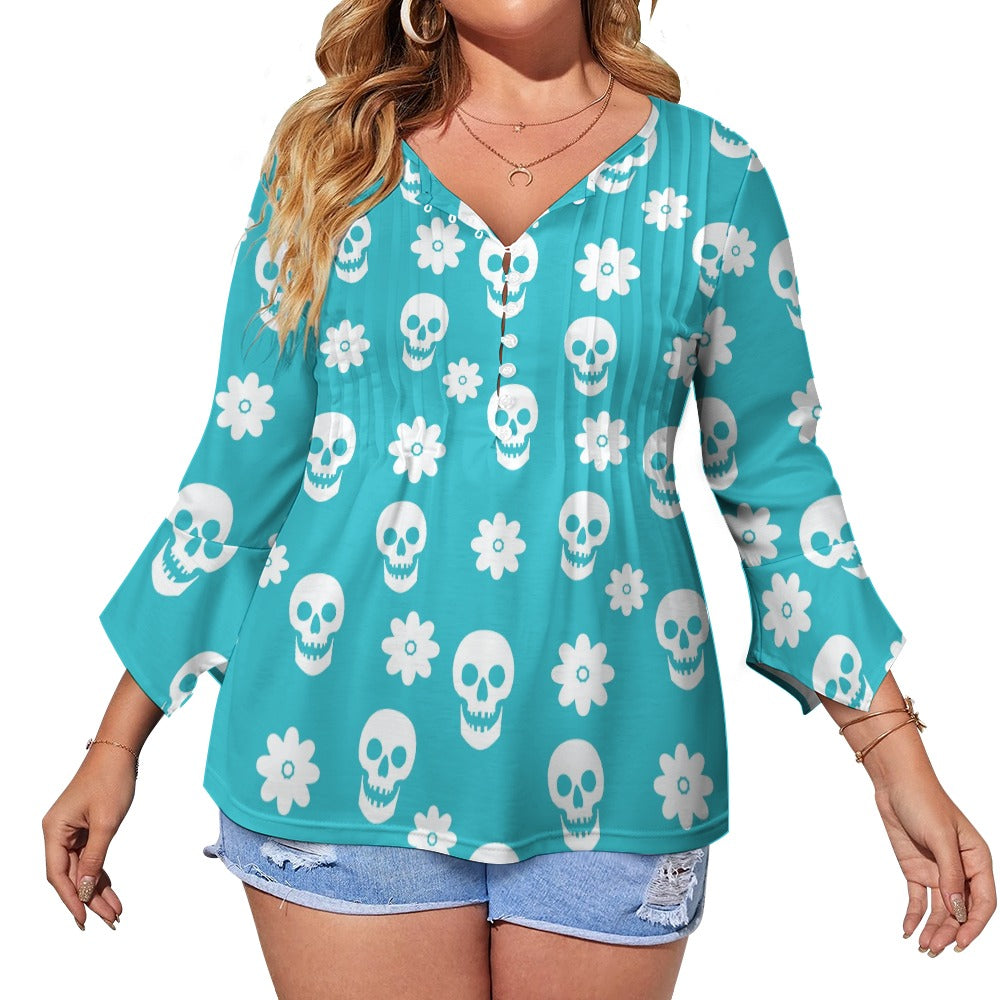 Lt Blue Floral Skulls Ruffled Petal Sleeve Top
