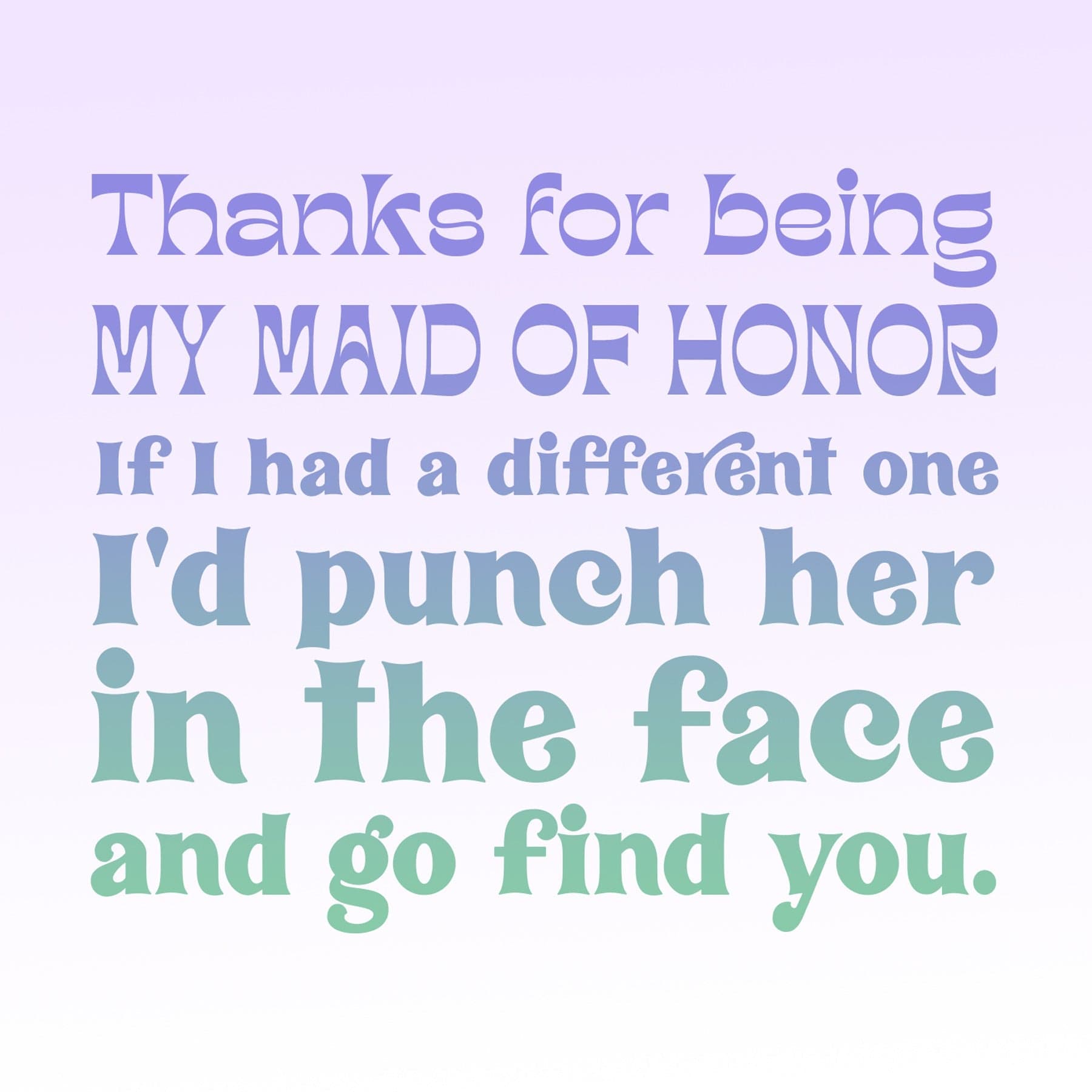 Maid of Honor Quote: Thanks for being MY MAID OF HONOR If I had a different one I'd punch her in the face and go find you.