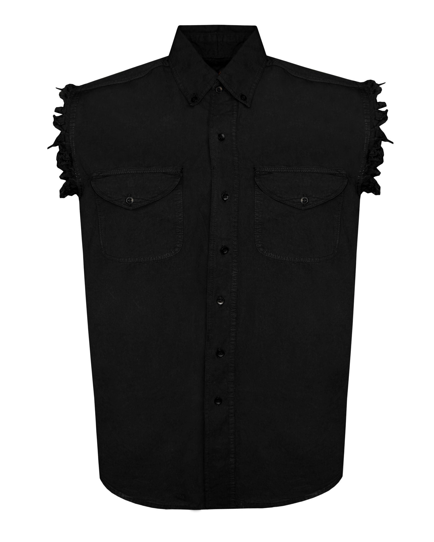 Get ready to hit the road in style with our Men's Biker Cutoff Cotton Shirt! This stonewashed black shirt boasts a sleek and cool worn look, perfect for any biker. The button down collar keeps it from slapping your face at high speeds and the frayed sleeves are crafted just right. With two chest pockets, it's both functional and fashionable. Made of 100% cotton for ultimate comfort.
