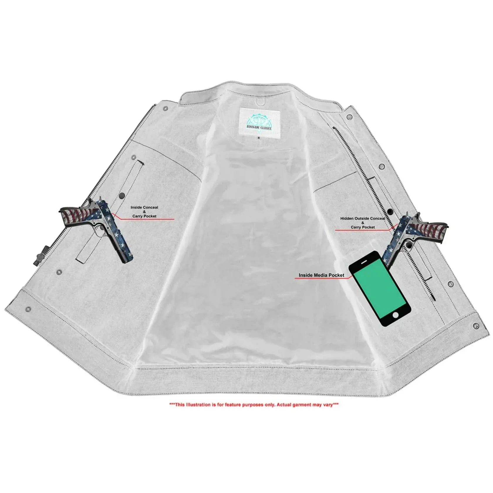 2 upgraded style concealed gun pockets between the snap and the zipper made of special heavy duty textile with built-in holsters and snap closure.