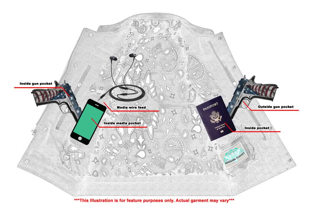 - 2 upgraded style concealed gun pockets between the snap and the zipper made of special heavy-duty textile with built-in holsters and snap closure.