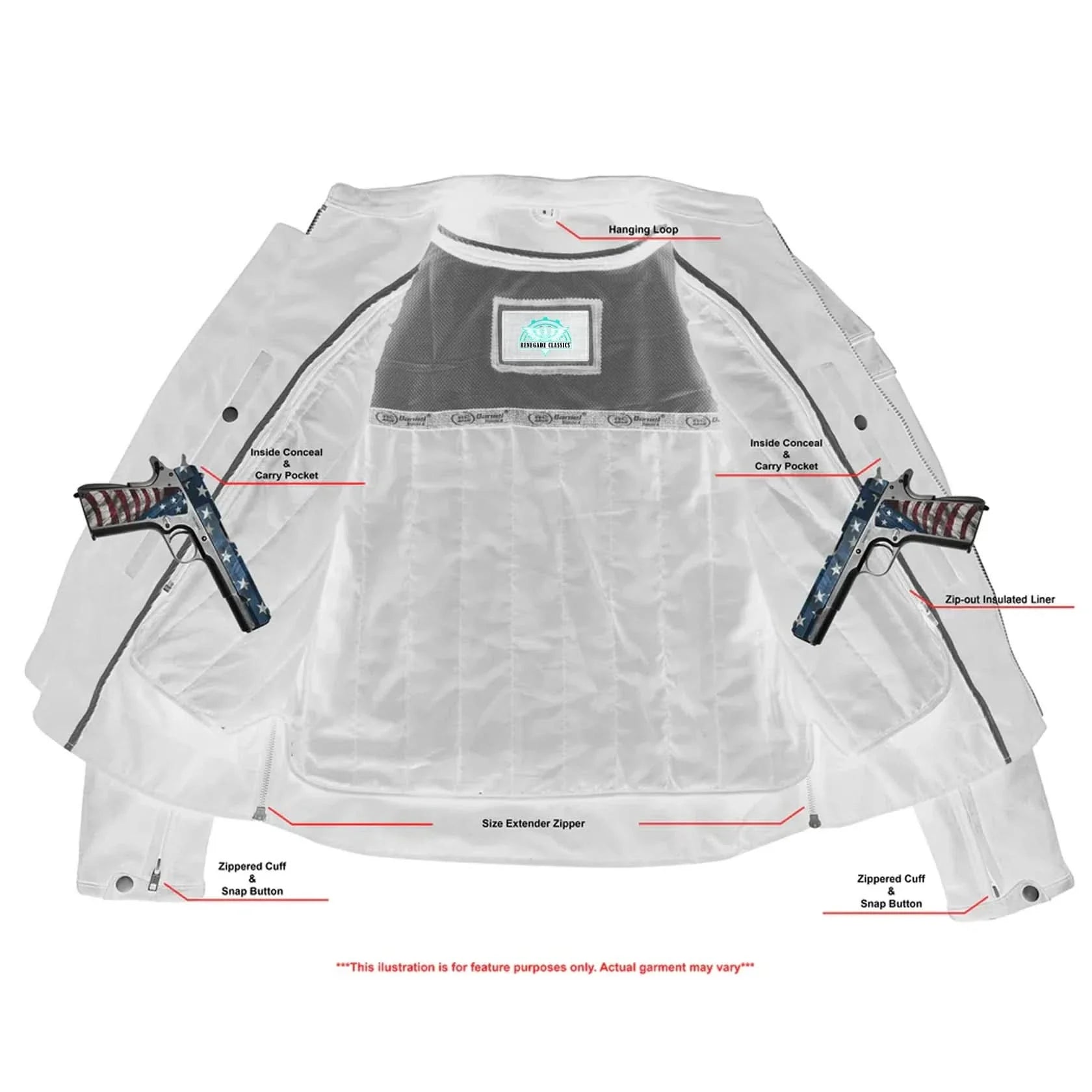 2 inside concealed gun pockets made of special heavy duty textile with built-in holsters and snap closure.