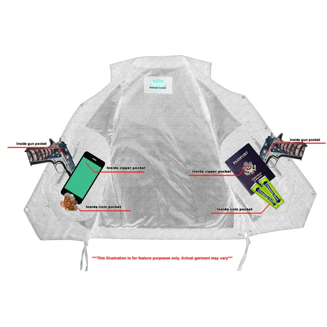 Built in dual side concealed gun pockets with built-in holsters and snap closure.