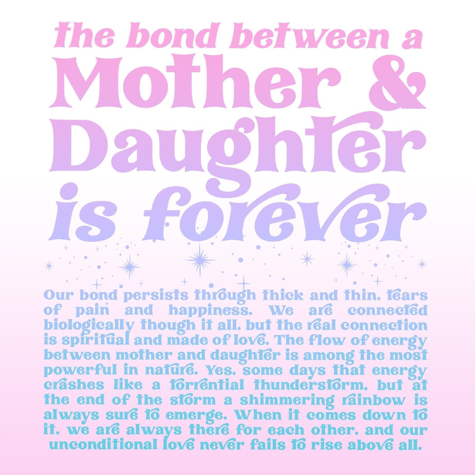 Mother & Daughter Quote: Our bond persists through thick and thin. Tears of pain and happiness. We are connected biologically through it all. But the real connection is spiritual and made of love. The flow of energy between mother and daughter is among the most powerful in nature. Yes, some days that energy crashes like a torrential thunderstorm. But at the end of the storm a shimmering rainbow is always sure to emerge. When it comes down to it, we are always there for each other and our unconditional love never falls to rise above all.