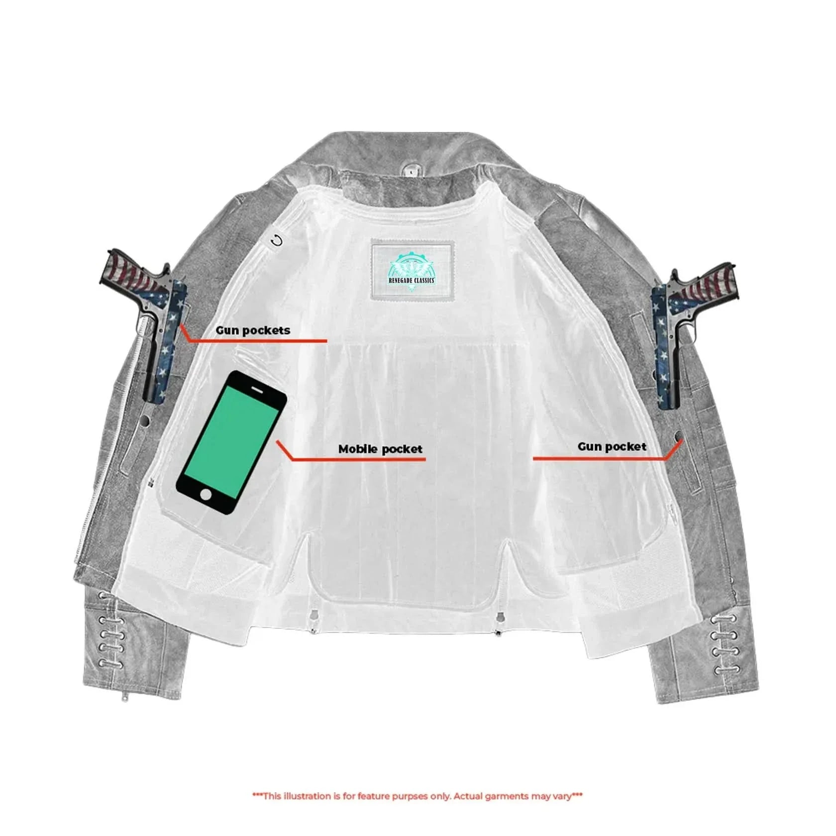 2 inside concealed gun pockets made of special heavy-duty textile with built-in holsters and snap closure.