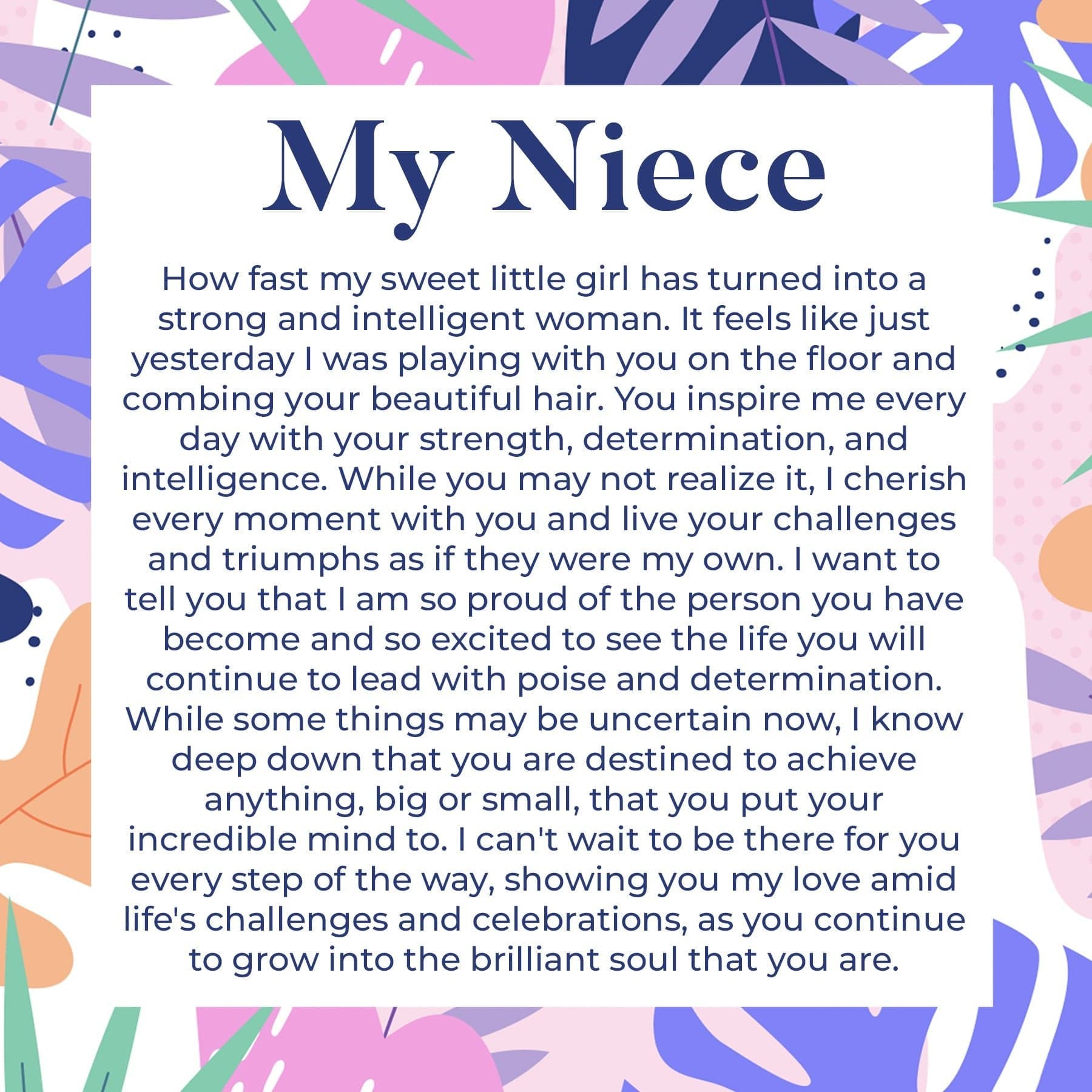 Niece Quote: How fast my sweet little girl has turned into a strong and intelligent woman. It feels like just yesterday I was playing with you on the floor and combing your beautiful hair. You inspire me every day with your strength, determination, and intelligence. While you may not realize it, I cherish every moment with you and live your challenges and triumphs as if they were my own. I want to tell you that I am so proud of the person you have become and so excited to see the life you will continue to lead with poise and determination. While some things may be uncertain now, I know deep down that you are destined to achieve anything, big or small, that you put your incredible mind to. I can't wait to be there for you every step of the way, showing you my love amid life's challenges and celebrations, as you continue to grow into the brilliant soul that you are.