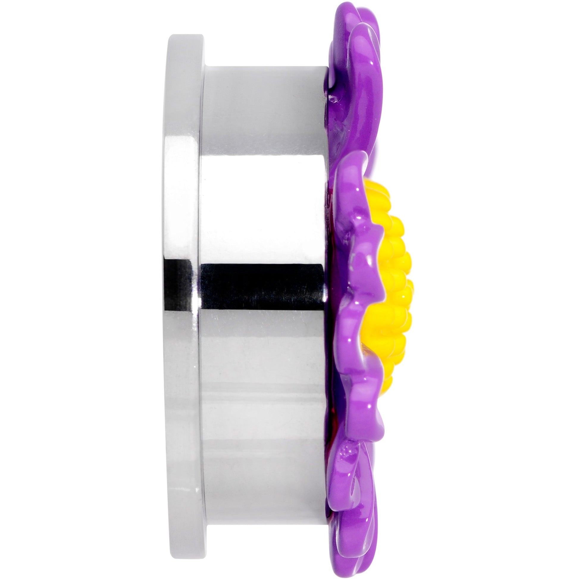 Let the daisies on these plugs decorate your stretched lobes in colorful style! They're made with 316L surgical grade stainless steel and each one features a three-dimensional purple and yellow flower charm on the front. They also feature a screw fit design that combines easy insertion with secure wear for a fit you're going to love. Your earlobes will blossom with these delicious daisies in them! Sold as a set of two.Specifications
