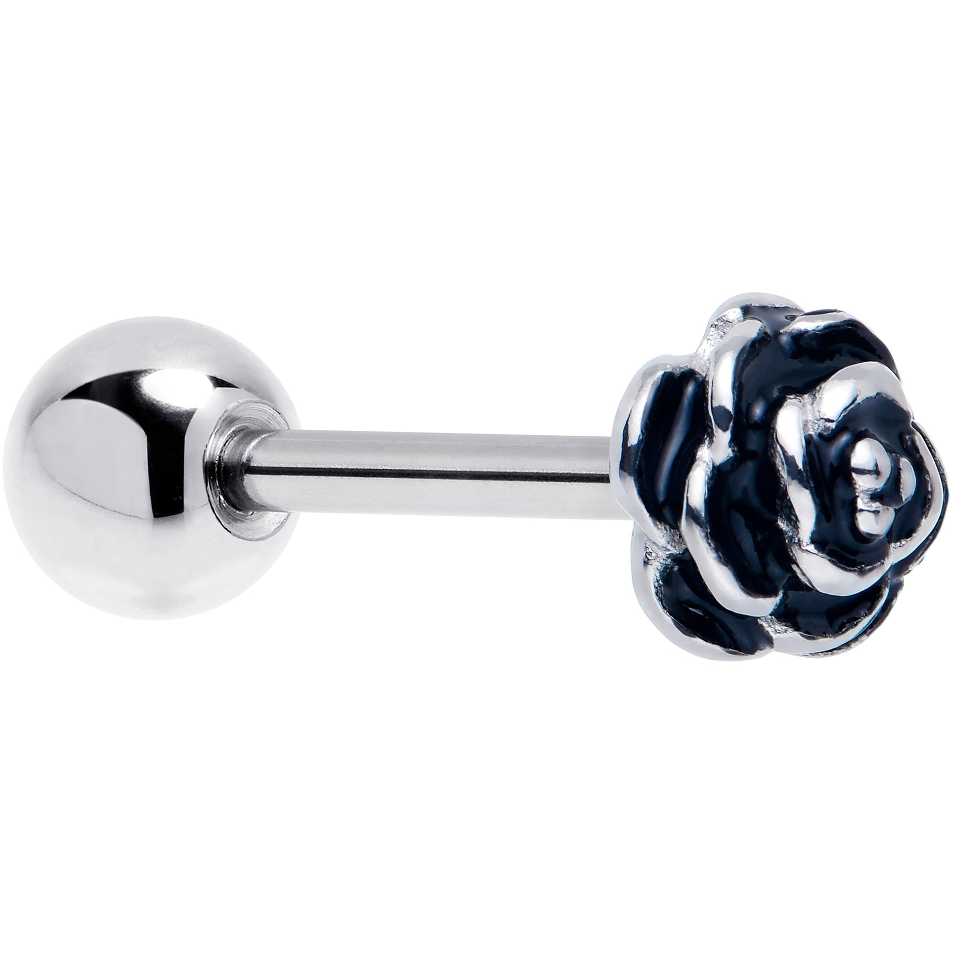 What could feel more elegant than this 14 gauge tongue jewelry? It is made with a 5/8 inch 316L surgical grade stainless steel straight barbell with a 6mm bottom ball end. The top end features a multi-dimensional rose flower charm, with simple and elegant detailing and a burnished effect to make the details pop. Get ready to fall in love with this charming and stylish tongue piercing ring.Specifications