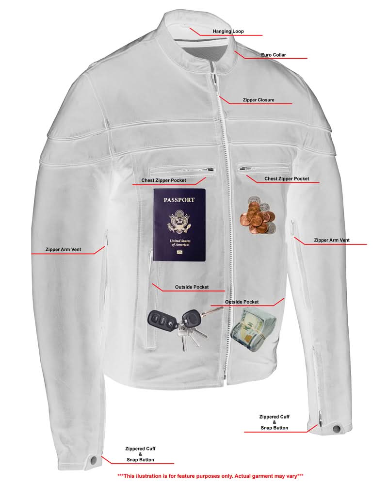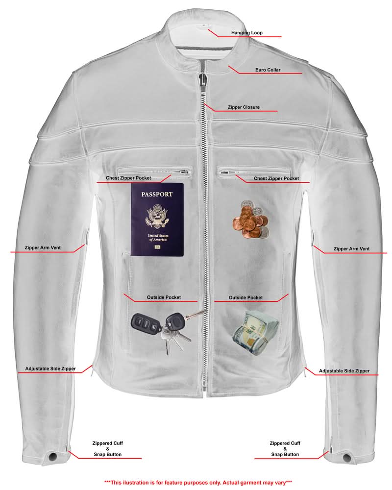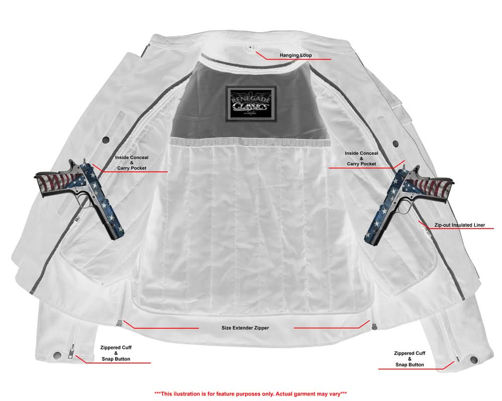 - 2 inside concealed gun pockets made of special heavy duty textile with built-in holsters and snap closure.