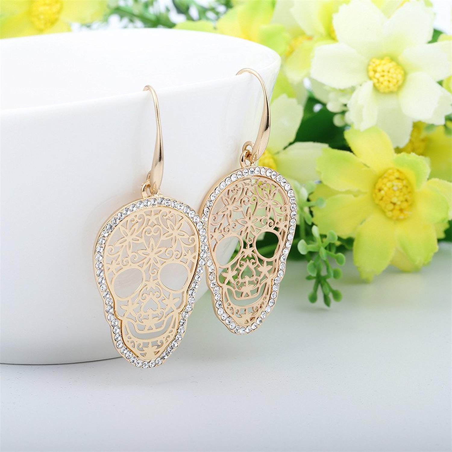 Gorgeous sugar skull drop earrings trimmed with shiny white crystals. Perfect for the autumn time when the mist starts to appear just above the ground when the air is getting colder and the spooky Halloween is just around the corner.