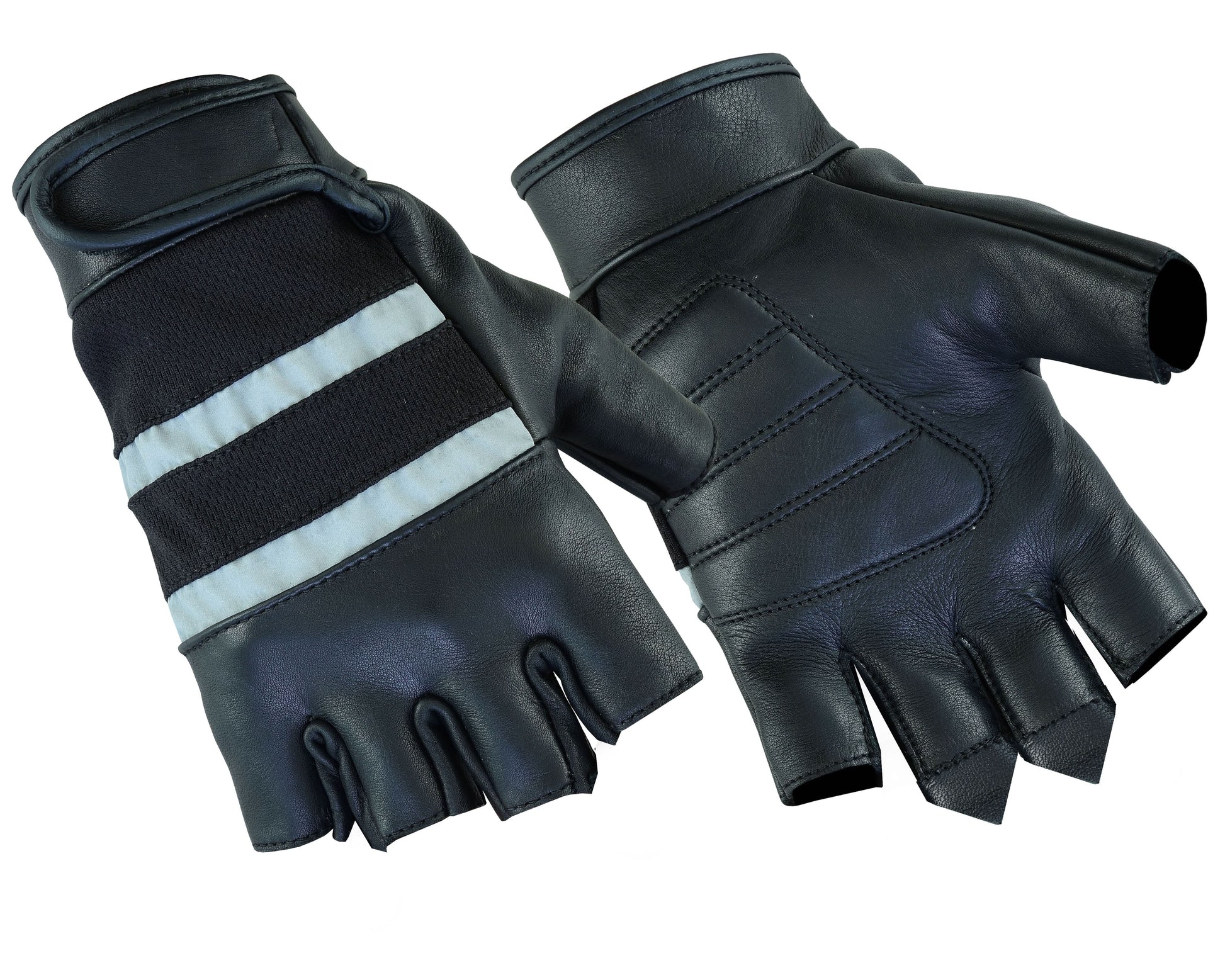 Traditional fingerless glove made in premium drum dyed naked cow, featuring gel palm for long haul comfort, reflective stripes to enhance night time visibility, finger pulls for easy removal, mesh for air flow and an adjustable wrist strap.