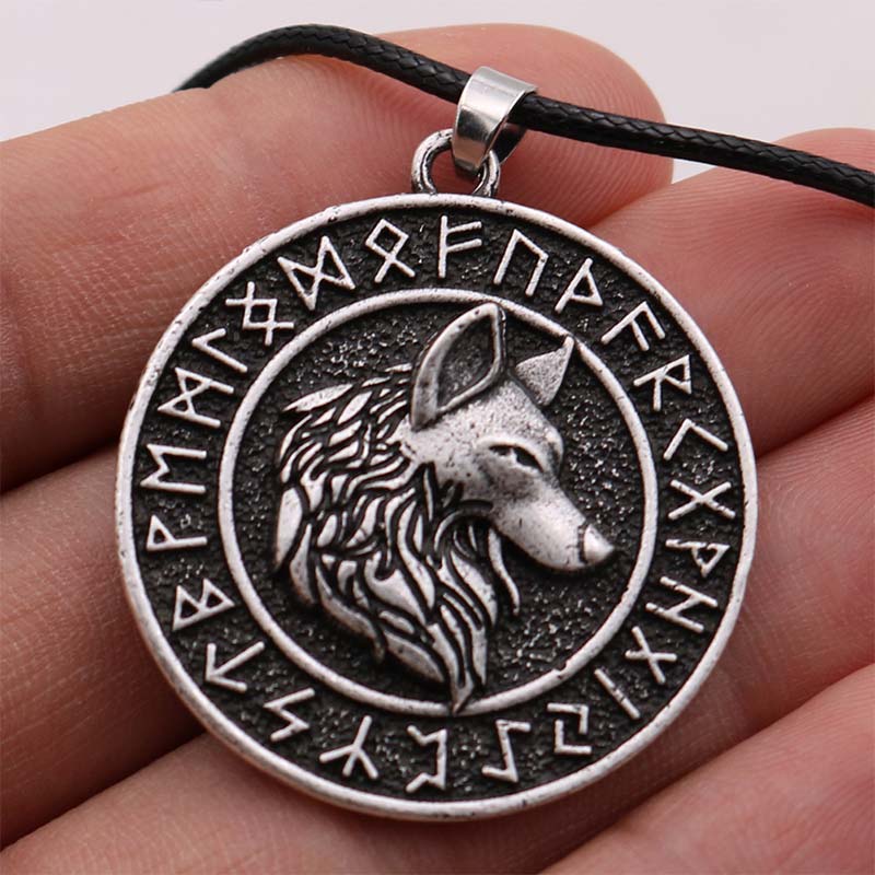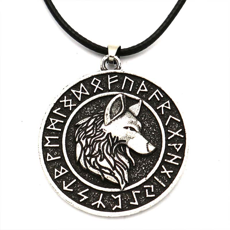 Viking Wolf Head Rune Metal Necklace 23.6''