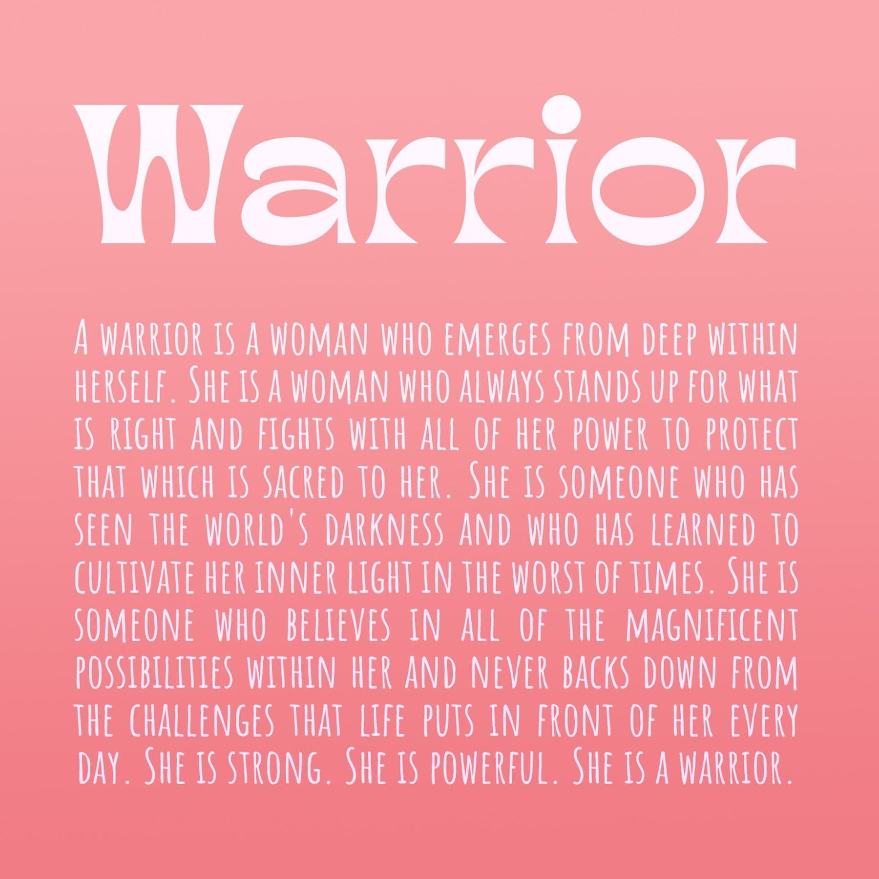 Warrior Quote: A Warrior is a woman who emerges from deep within herself. she is a woman who always stands up for what is right and fight with all of her power to protect that which is sacred to her. she is someone who has seen the world's darkness and who has learned to cultivate her inner light in the worst of time. she is someone who believes in all of the magnificent possibilities within her and never backs down from the challenges that life puts in front of her every day. she is strong. she is powerful. she is a warrior.