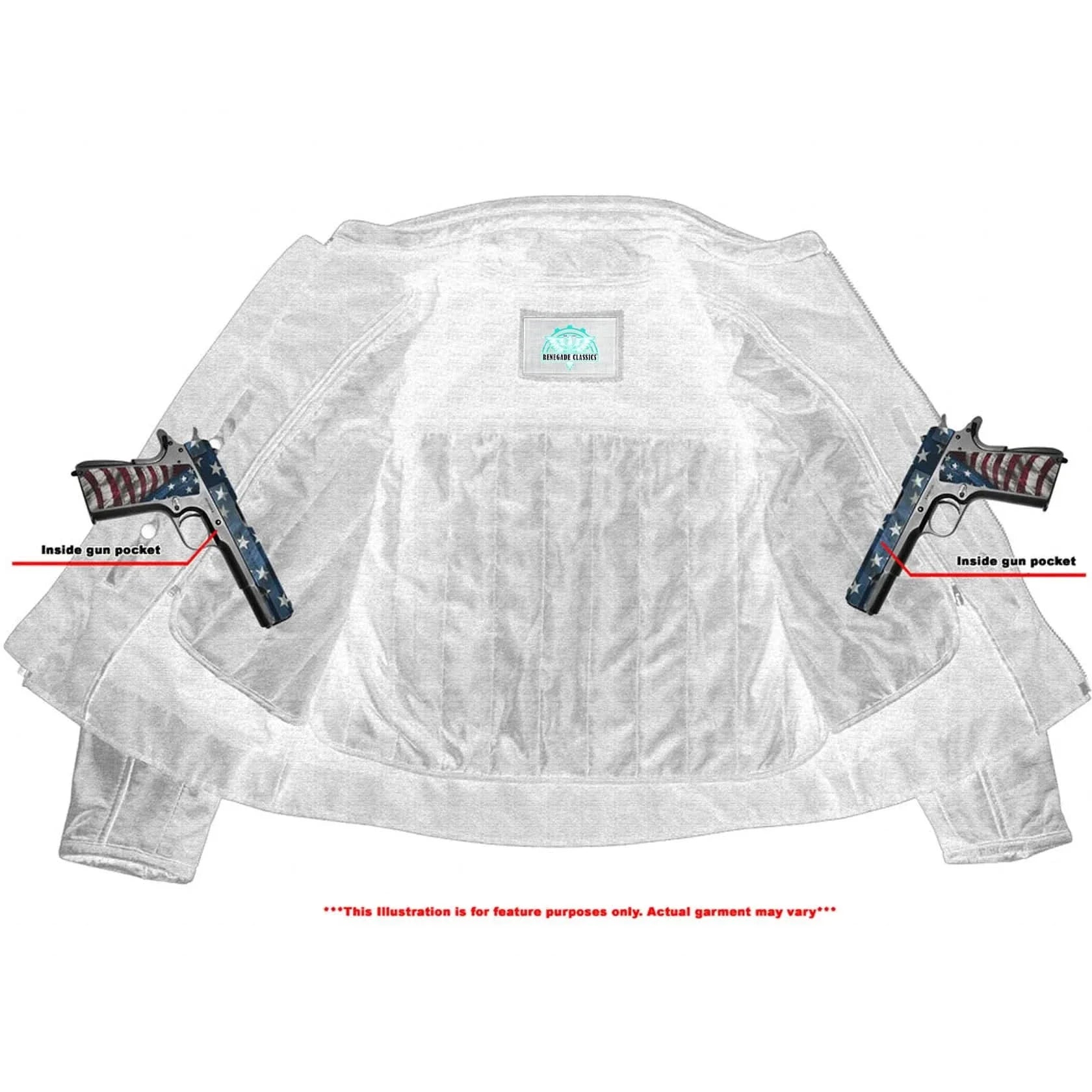 Three zippered pocket front, snap down collar and lapels.